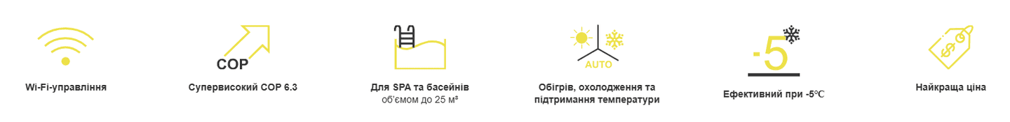 Работает с максимальным коэффициентом производительности: COP 6,3, что обеспечивает эффективность и экономию энергии в процессе обогрева или охлаждения воды в бассейне.
