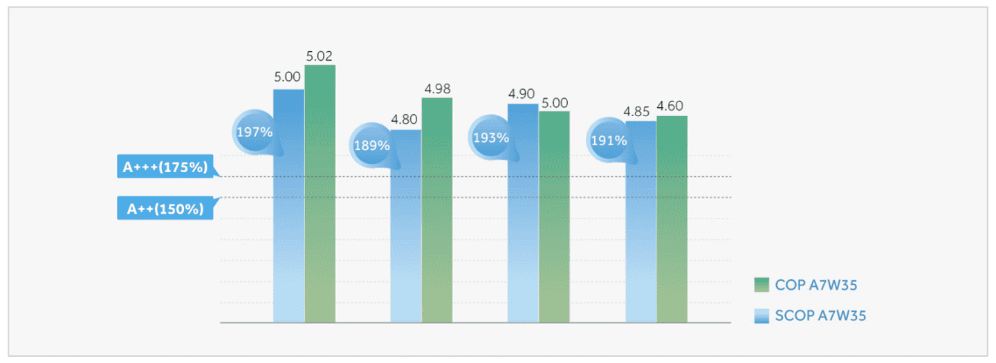 Тепловой насос Haier Super Aqua обеспечивает высочайший уровень энергоэффективности, достигая класса A+++ при температуре воды 35°C и A++ при температуре воды 55°C. Это позволяет значительно уменьшить затраты на электроэнергию и эксплуатационные расходы по сравнению с традиционными системами отопления.