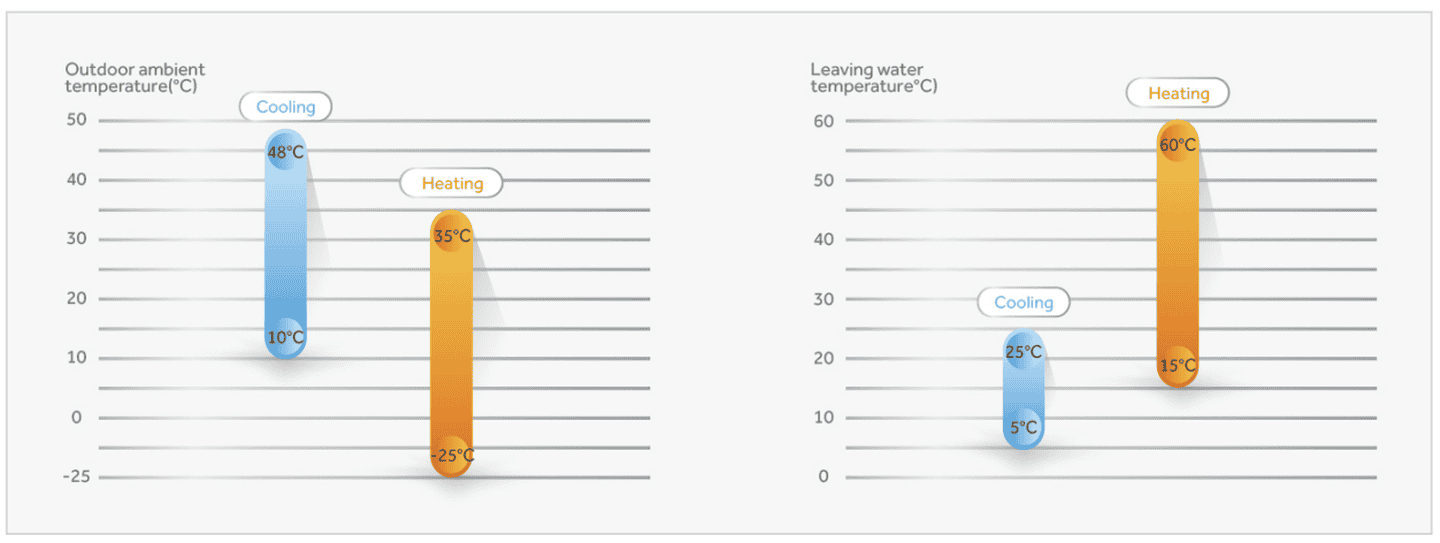 Тепловой насос функционирует даже при экстремально низких температурах до -25°C, обеспечивая стабильное отопление даже в холодных регионах.