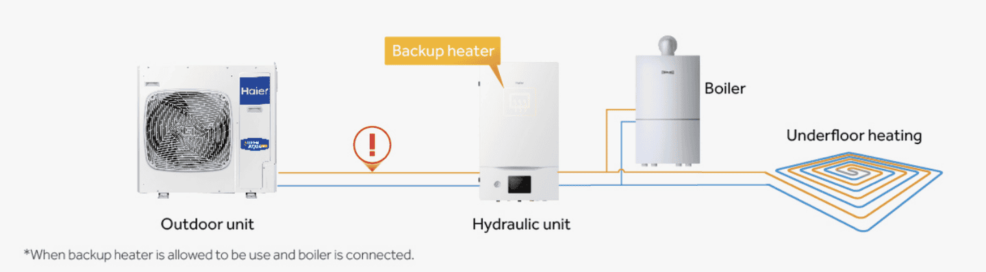 При возникновении неисправностей Haier Super Aqua может работать в связке с котлом. В случае непредвиденной поломки устройство автоматически переключается на работу котла или резервного нагревателя, обеспечивая непрерывное отопление помещения.