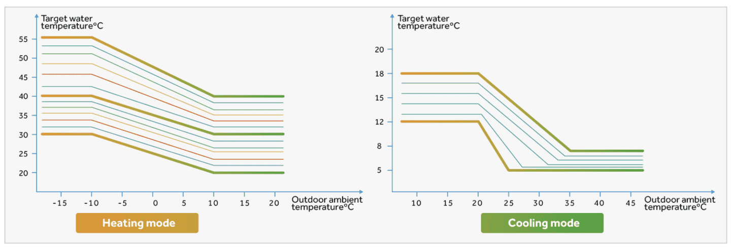 Функция «Climate Curves» позволяет автоматически регулировать температуру в зонах 1 и 2 в зависимости от температуры окружающей среды. Пользователь может установить персонализированную климатическую кривую, что повышает комфорт и уменьшает затраты электроэнергии.