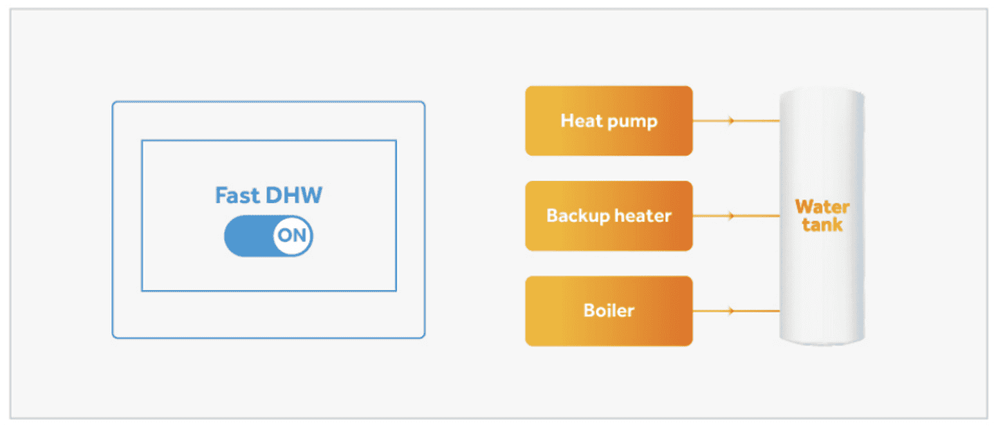 При активации режима Fast DHW тепловой насос активирует резервный нагреватель или дополнительный источник тепла, чтобы как можно быстрее достичь заданной температуры горячей воды, независимо от внешних условий и времени работы компрессора.