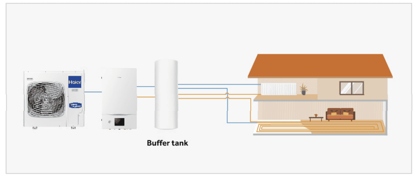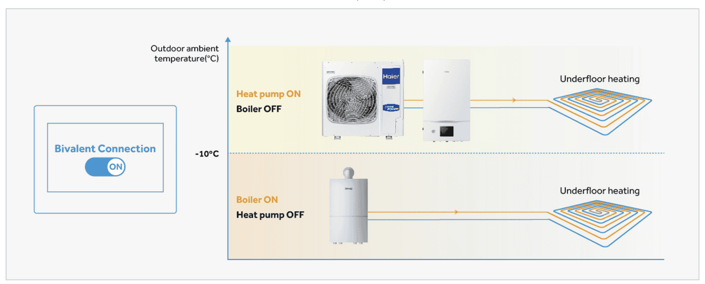 Система может работать совместно с котлом, а функция «bivalent connection» позволяет тепловому насосу контролировать всю систему, автоматически включая котел в случае необходимости.