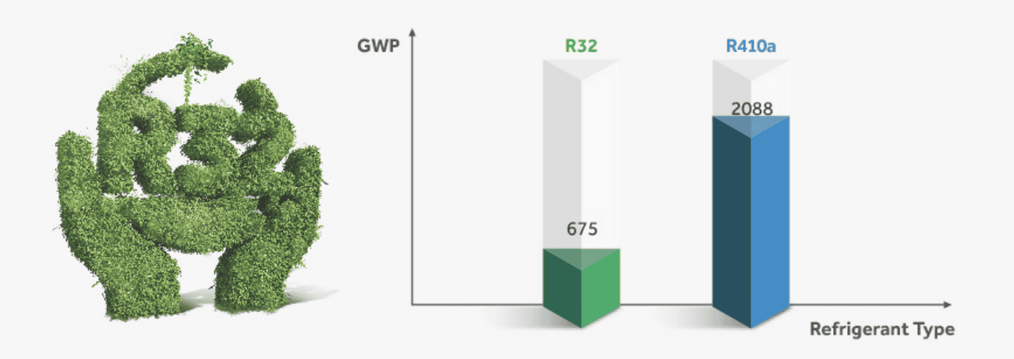 Система использует возобновляемую энергию окружающей среды, что значительно снижает эксплуатационные расходы и выбросы CO₂ по сравнению с традиционными газовыми или твердотопливными котлами. Использование хладагента R32, который имеет низкий коэффициент влияния на глобальное потепление (GWP), делает этот тепловой насос одним из самых экологичных решений на рынке.