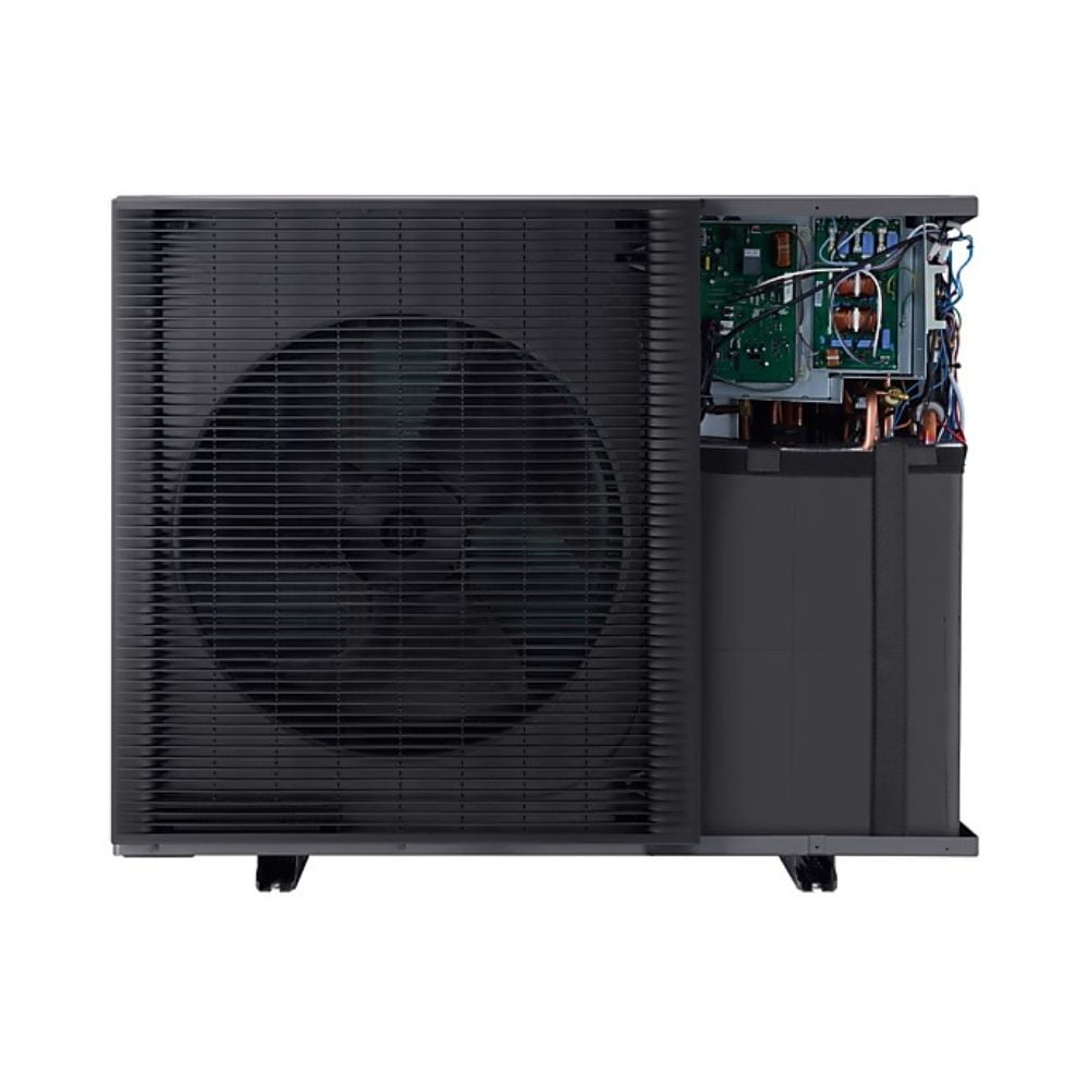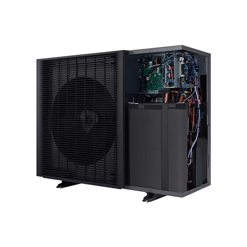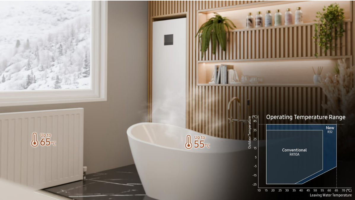 Система способна подавать воду с температурой до 65 °C для отопления радиатора даже при –5 °C снаружи, и до 55 °C для горячей воды бытового назначения. Это уменьшает потребность в дополнительном нагревателе. Компрессор Twin Rotary эффективно передает тепло и работает на высоком давлении.