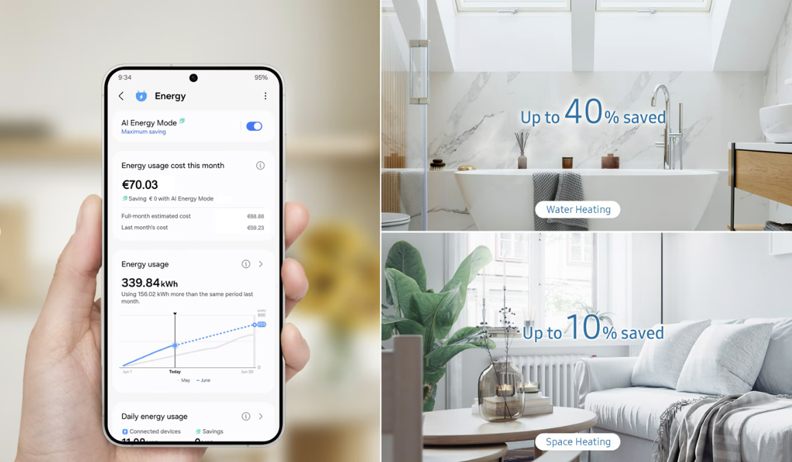 Система разработана так, чтобы экономить энергию без потери производительности: увеличена площадь теплообмена, уменьшены теплопотери, повышена эффективность нагрева воды со 115% до 148%, а потребление электроэнергии может быть снижено до ~20%. Режим AI Energy позволяет сократить использование энергии до 17%.