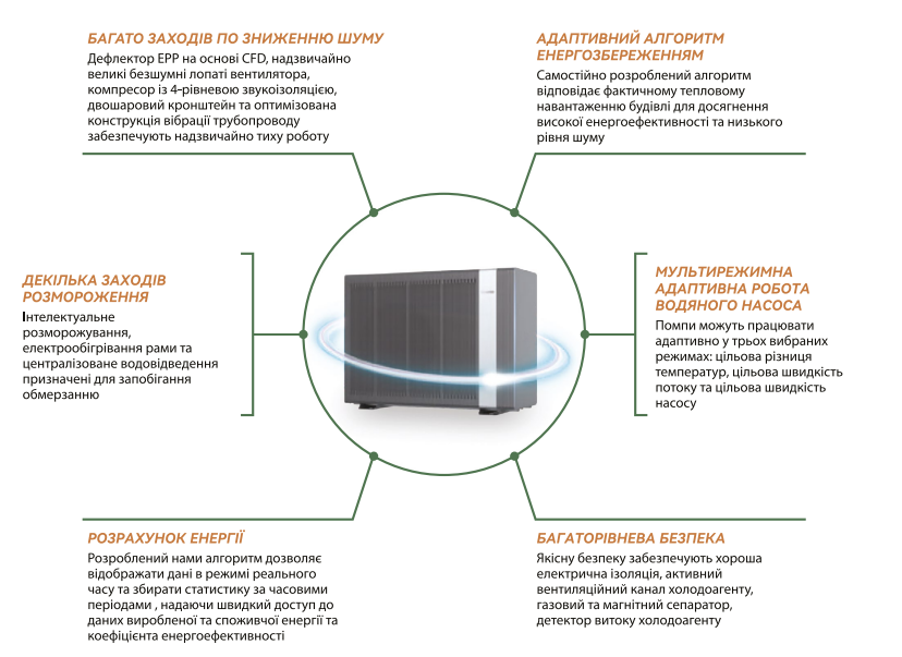 Технология EVI (Enhanced Vapor Injection) позволяет эффективно работать при низких температурах до -25°C, поддерживая стабильную тепловую мощность.