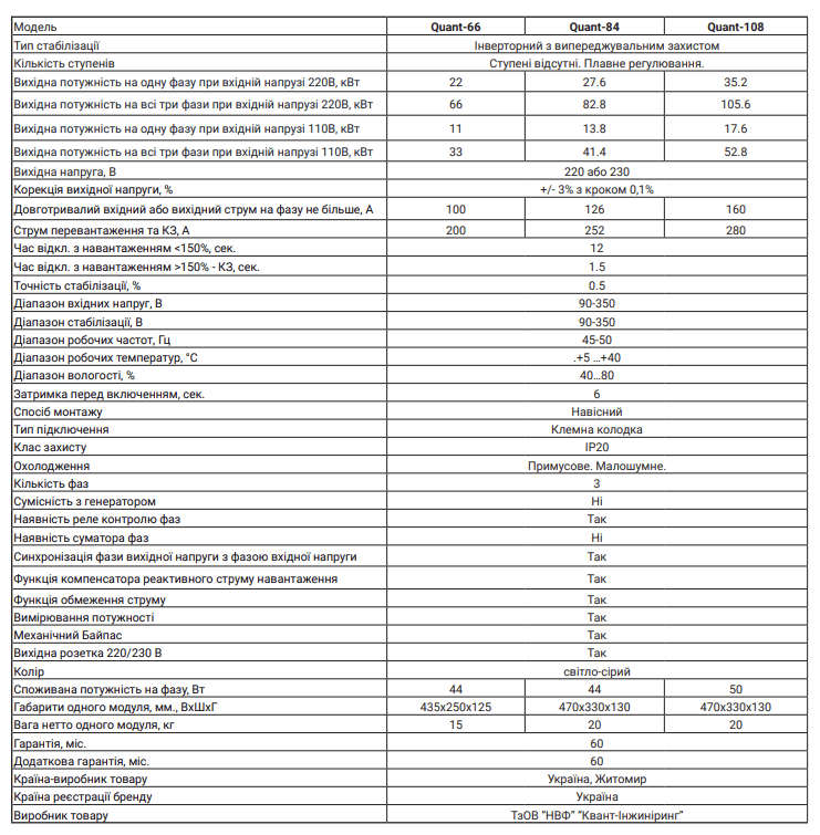 Quant-108 — трехфазный стабилизатор с возможностью однофазной работы и имеющимся сумматором мощности фаз (со встроенным блоком контроля фаз). Quant-108 — это шесть однофазных инверторных стабилизаторов напряжения Quant-18, которые работают с сумматором мощности. Главное отличие Quant-108 от обычного трехфазного стабилизатора без синхронизатора фаз в том, что он защищает трехфазное оборудование при неисправной трехфазной сети.