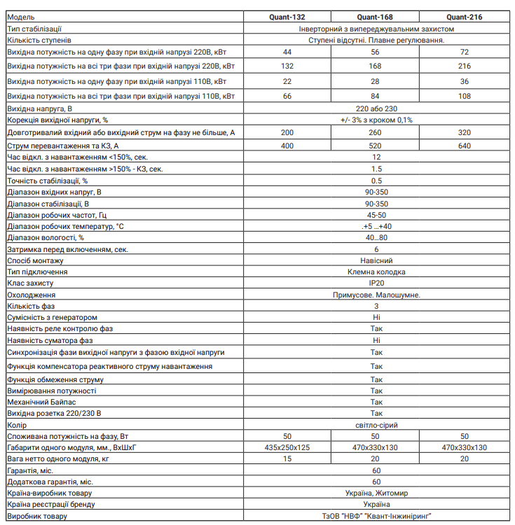 Quant-216 — трехфазный стабилизатор с возможностью однофазной работы и имеющимся сумматором мощности фаз (со встроенным блоком контроля фаз). Quant-216 — это двенадцать однофазных инверторных стабилизаторов напряжения Quant-18, которые работают с сумматором мощности. Главное отличие Quant-216 от обычного трехфазного стабилизатора без синхронизатора фаз в том, что он защищает трехфазное оборудование при неисправной трехфазной сети.