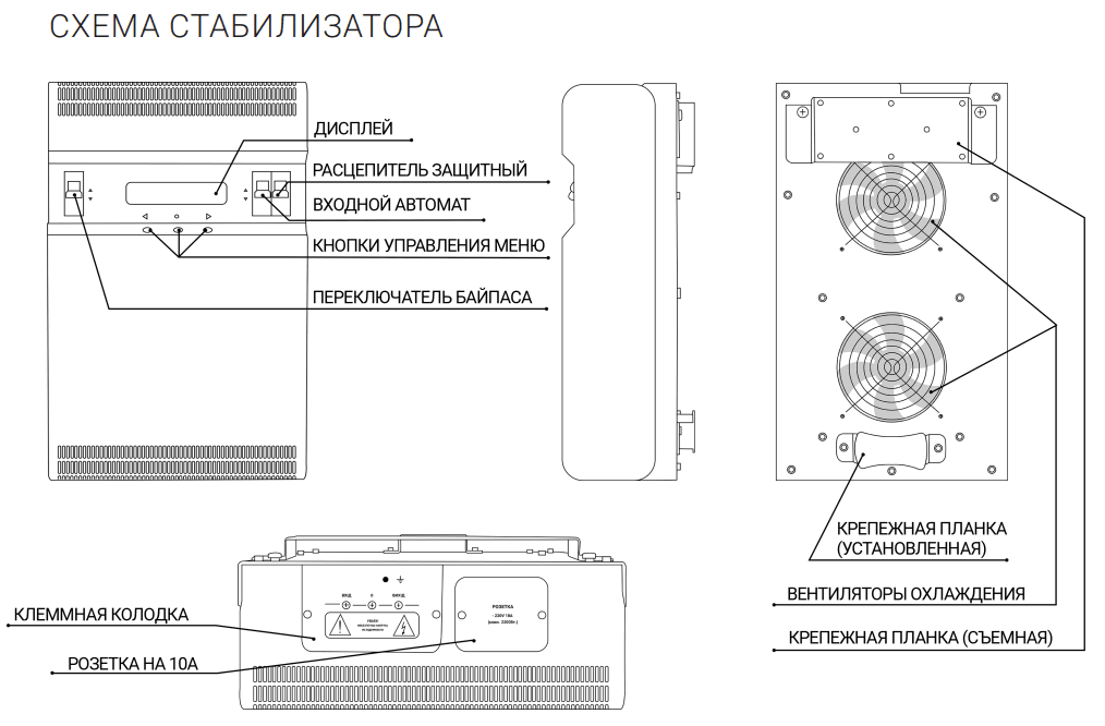 - Собственно стабилизатор: его входные и выходные фильтры, компенсатор реактивной мощности для режима нормальной работы, включая любые скачки и перепады напряжения в пределах допустимого диапазона стабилизации прибора.