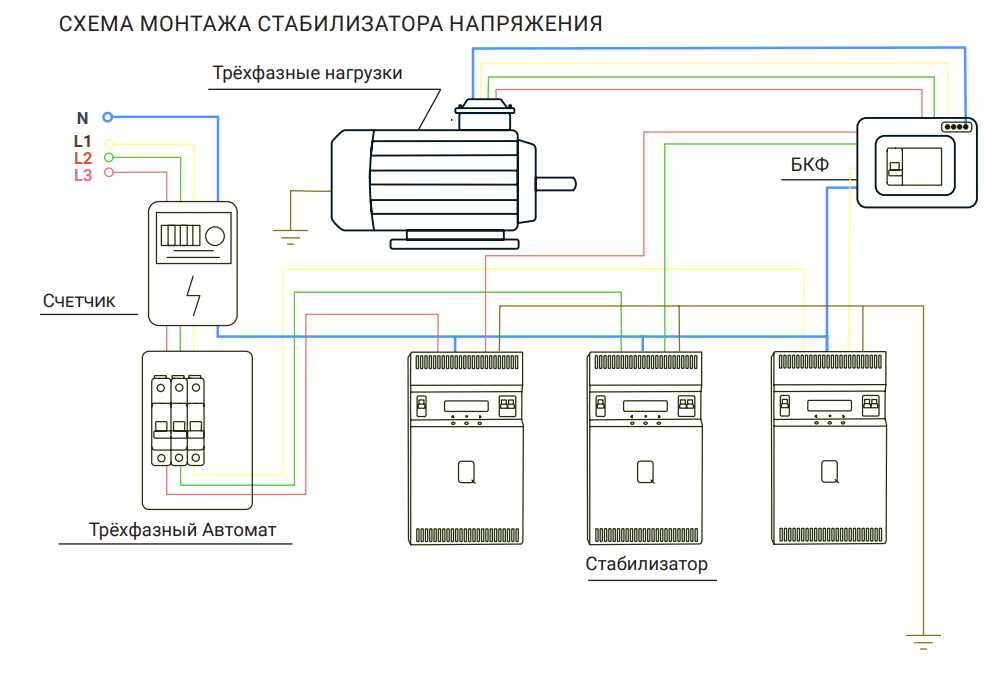 - Большинство опасных ситуаций решается без отключения стабилизатора, подавая на нагрузку чистое, отфильтрованное напряжение на фазу 220В (230В), 50Гц, и потребитель не заметит проблем, которые могли бы представлять опасность для его электроники.