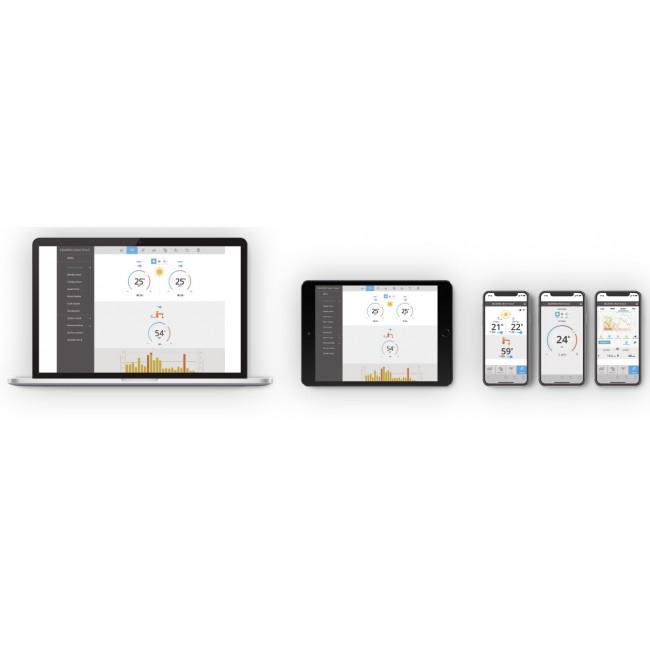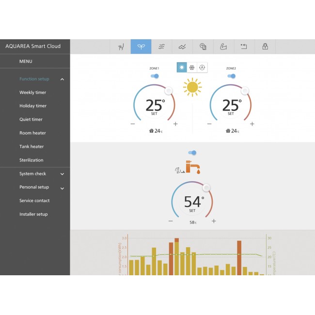 • Позволяет регулировать мощность обогрева, охлаждения, а также подачу горячей воды (при дополнительном подключении бака косвенного нагрева), отслеживать потребление электроэнергии, получать информацию об ошибках в работе и т.д.