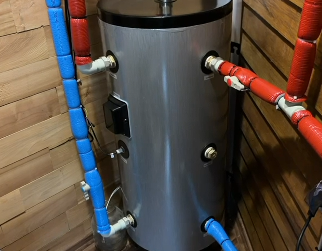 Качественная обвязка: На фото видно, что подключение выполнено с использованием надежной теплоизоляции (синего и красного цветов) для четкого разграничения подачи и «обратки», а также для сведения тепловых потерь к нулю.