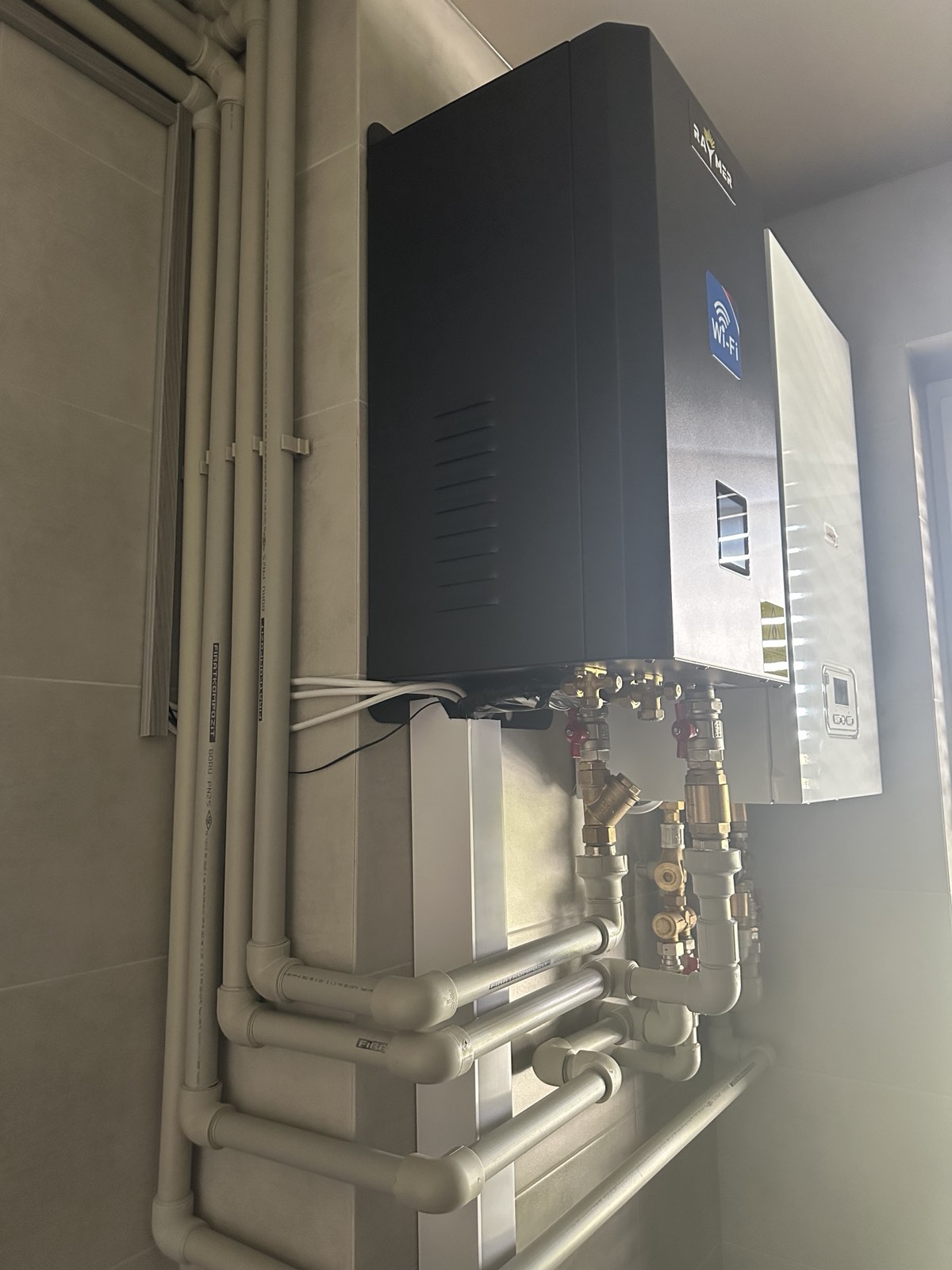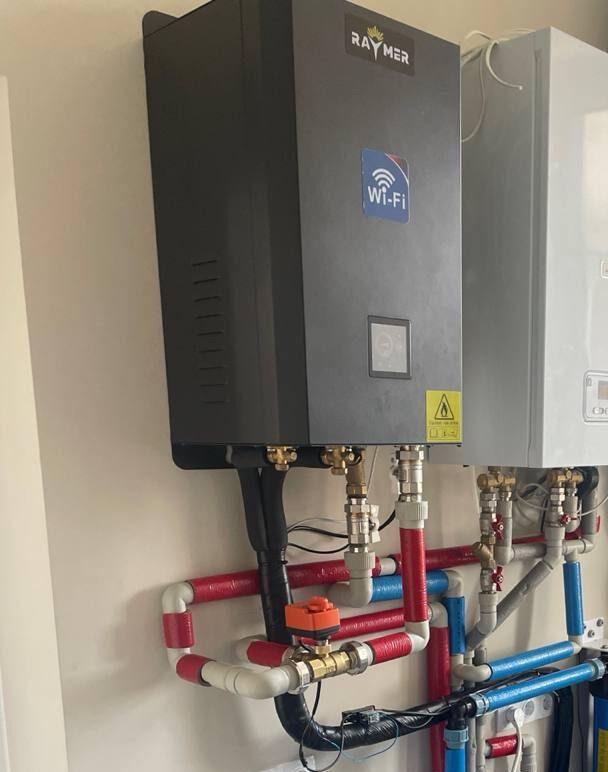 В рамках проекта модернизации существующей системы отопления была выполнена установка настенного гидромодуля теплового насоса Raymer RAY-10DS2-EVI непосредственно рядом с имеющимся электрическим котлом. Такой подход позволил аккуратно интегрировать новое оборудование в уже работающую систему, без необходимости полной реконструкции трубопроводов.