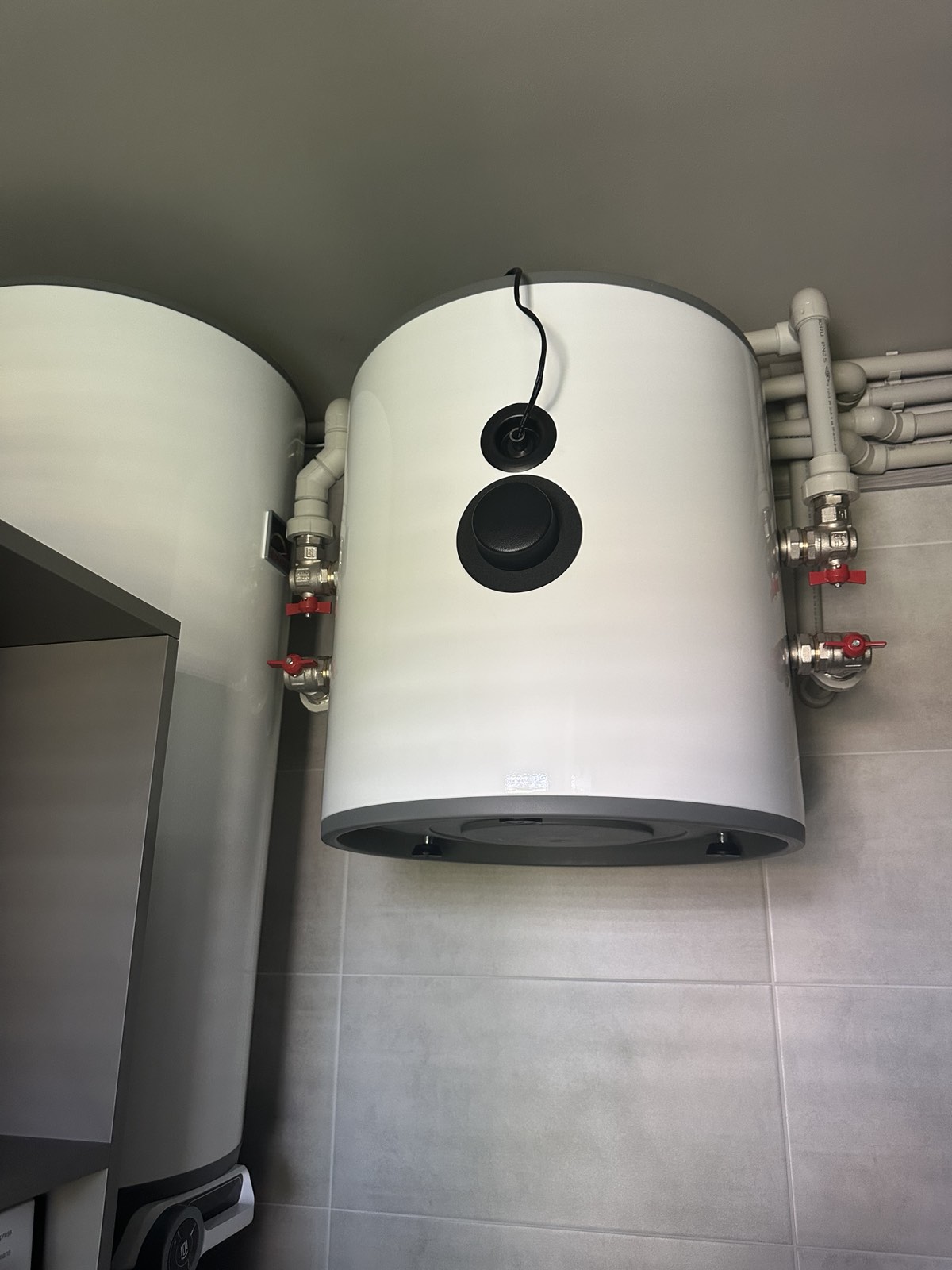 Обвязка бака выполнена аккуратно и компактно: подключены контуры холодной воды, горячей воды и рециркуляции, использованы запорные краны и группа безопасности. Все элементы легко доступны для дальнейшего технического обслуживания. Благодаря такому решению система работает надежно, экономно и полностью соответствует требованиям современного энергоэффективного дома.