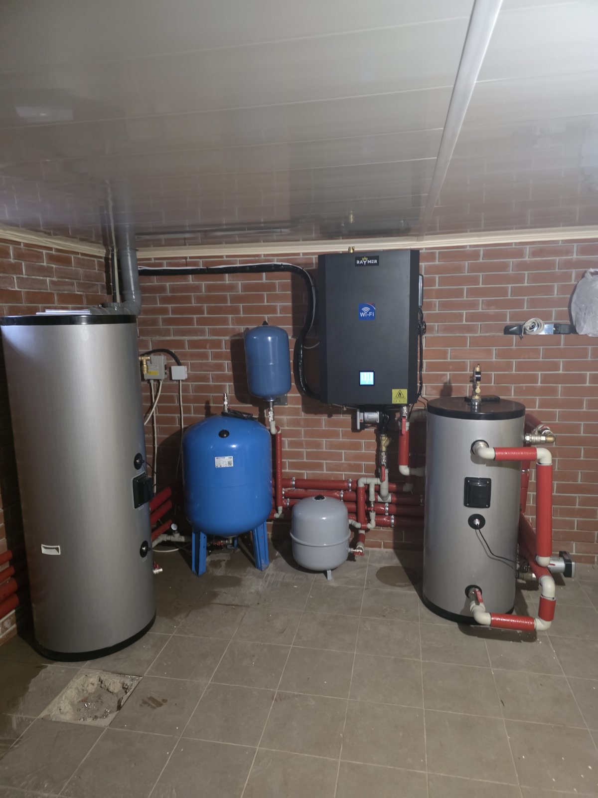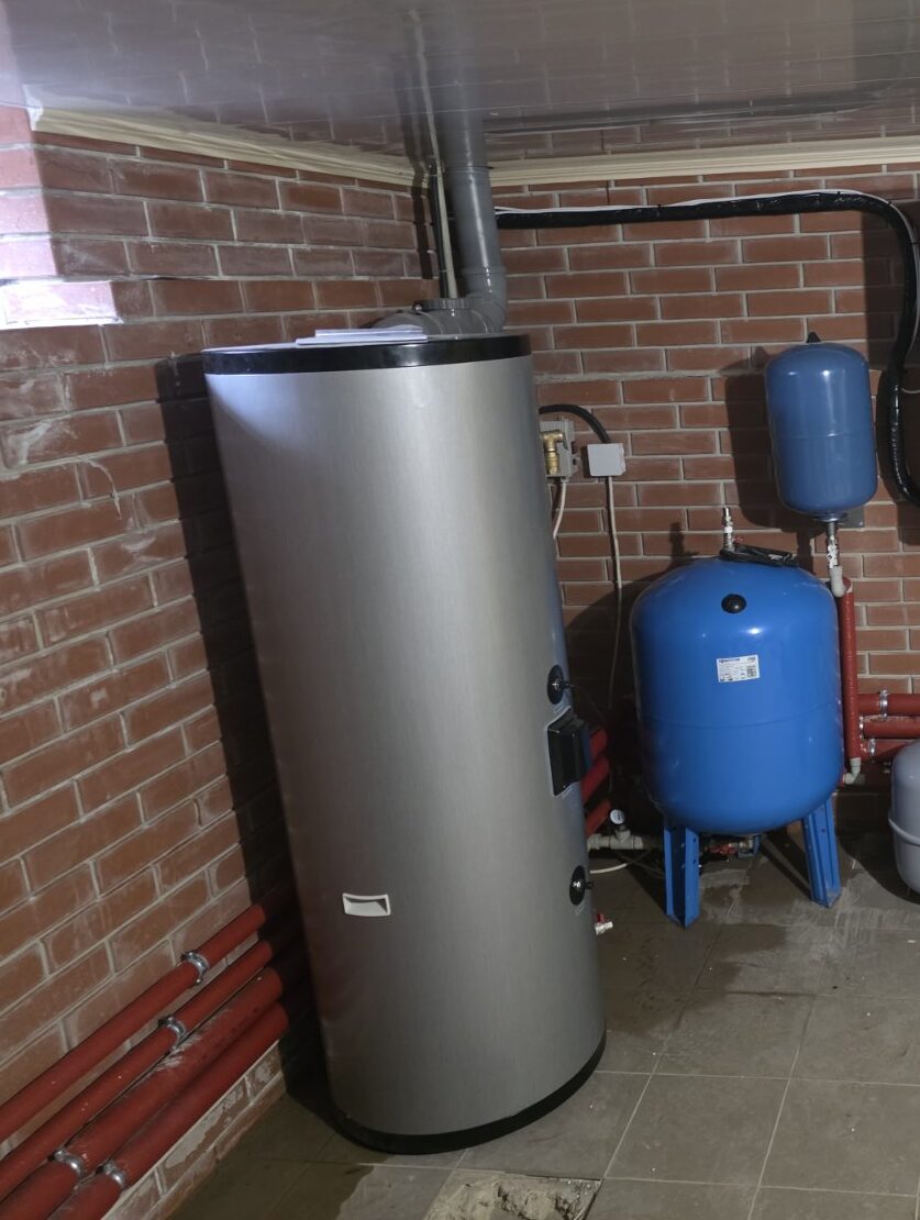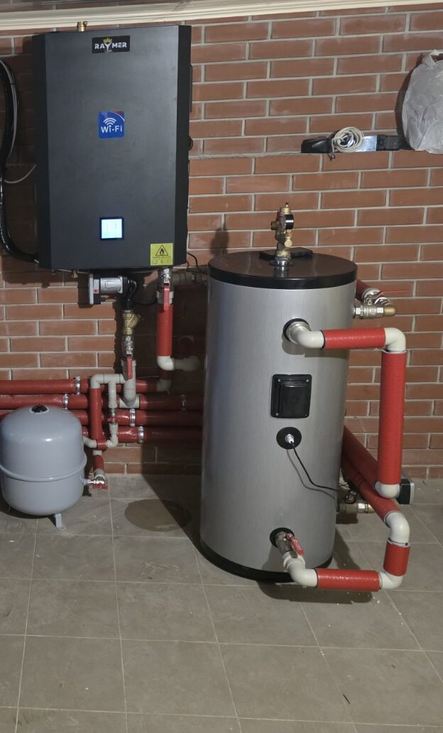 В котельном помещении выполнен монтаж бака ГВС Raymer DWHP 250 L, который работает как основной накопительный резервуар для горячей воды, нагретой тепловым насосом. Он расположен слева, рядом с расширительным баком и гидравлической обвязкой.