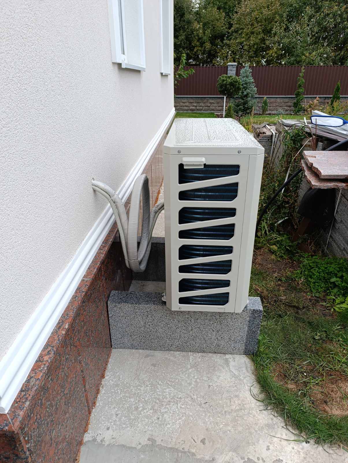 Наружный блок теплового насоса был установлен на каменных блоках, которая обеспечивает устойчивость всей конструкции. Дополнительно, блок установлен на антивибрационные опоры для уменьшения вибраций во время работы компрессора и вентилятора.