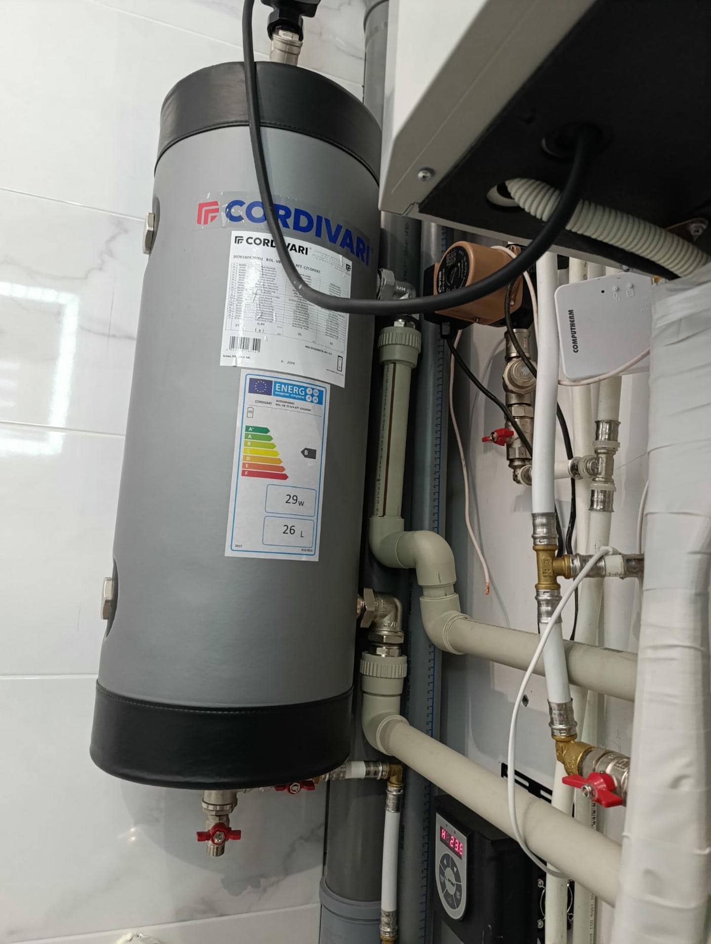 К гидромодулю теплового насоса была присоединена буферная емкость на 50 л, которая сохраняет нагретую воду, помогая поддерживать стабильную температуру в системе отопления. Это снижает частоту включения и выключения теплового насоса, продлевая его ресурс.