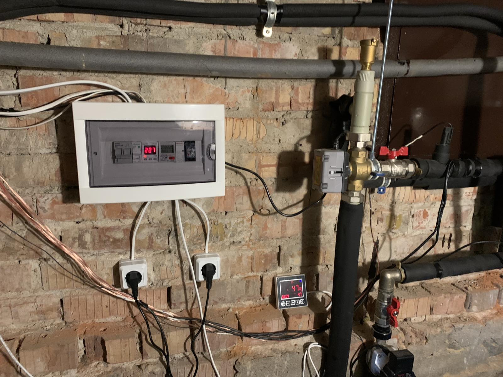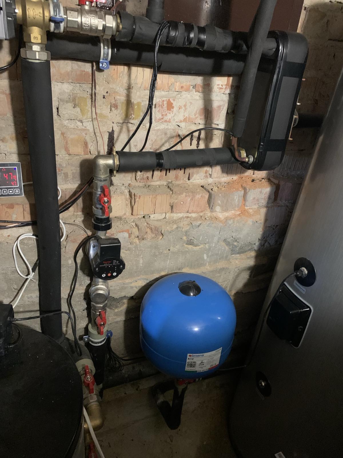 Все трубопроводы имеют качественную теплоизоляцию, что предотвращает тепловые потери, а система оснащена запорной арматурой и группой безопасности, которая гарантирует надежную эксплуатацию. Благодаря продуманной схеме подключения теплообменника и использованию трехходового клапана удалось обеспечить гибкость работы системы — тепловой насос автоматически переключается между контурами, поддерживая комфортную температуру в доме и горячую воду в баках.