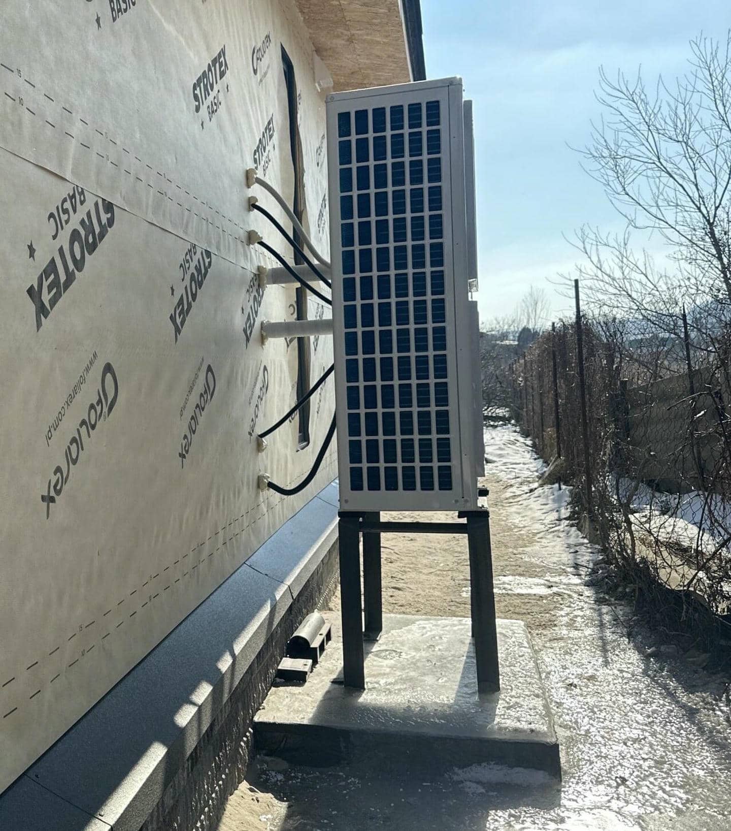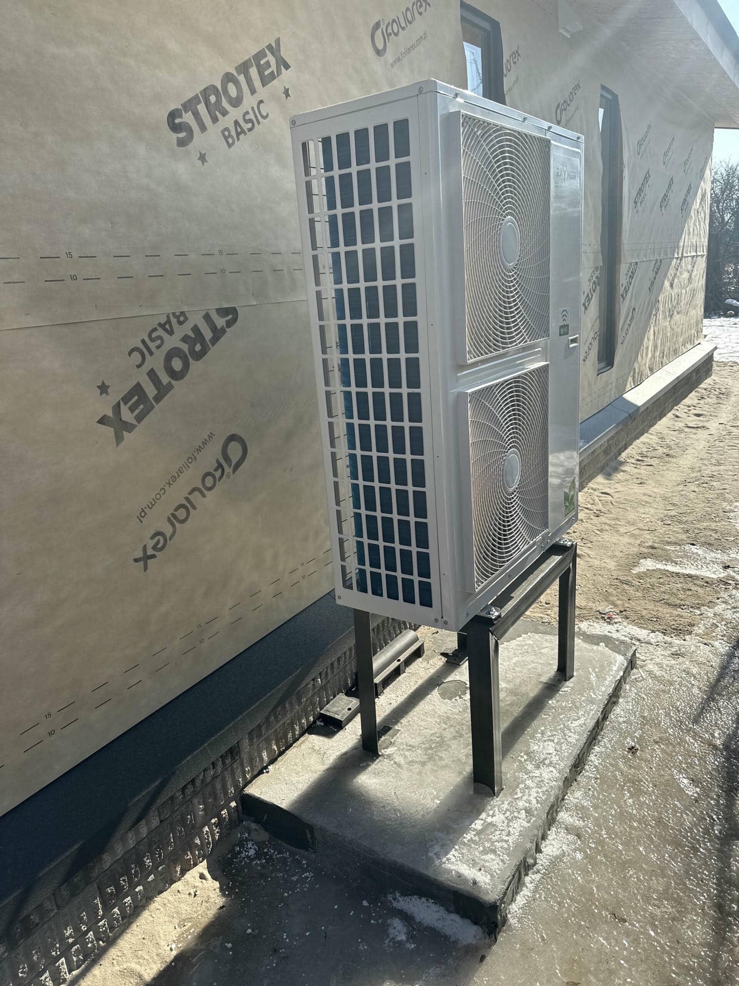 Наружный блок теплового насоса RAY-15MN был установлен на специальной металлической подставке, которая обеспечивает надежную фиксацию и защиту от механических повреждений. Подставка изготовлена из металлического профиля и установлена на бетонное основание, что гарантирует её устойчивость даже при вибрациях во время работы устройства.