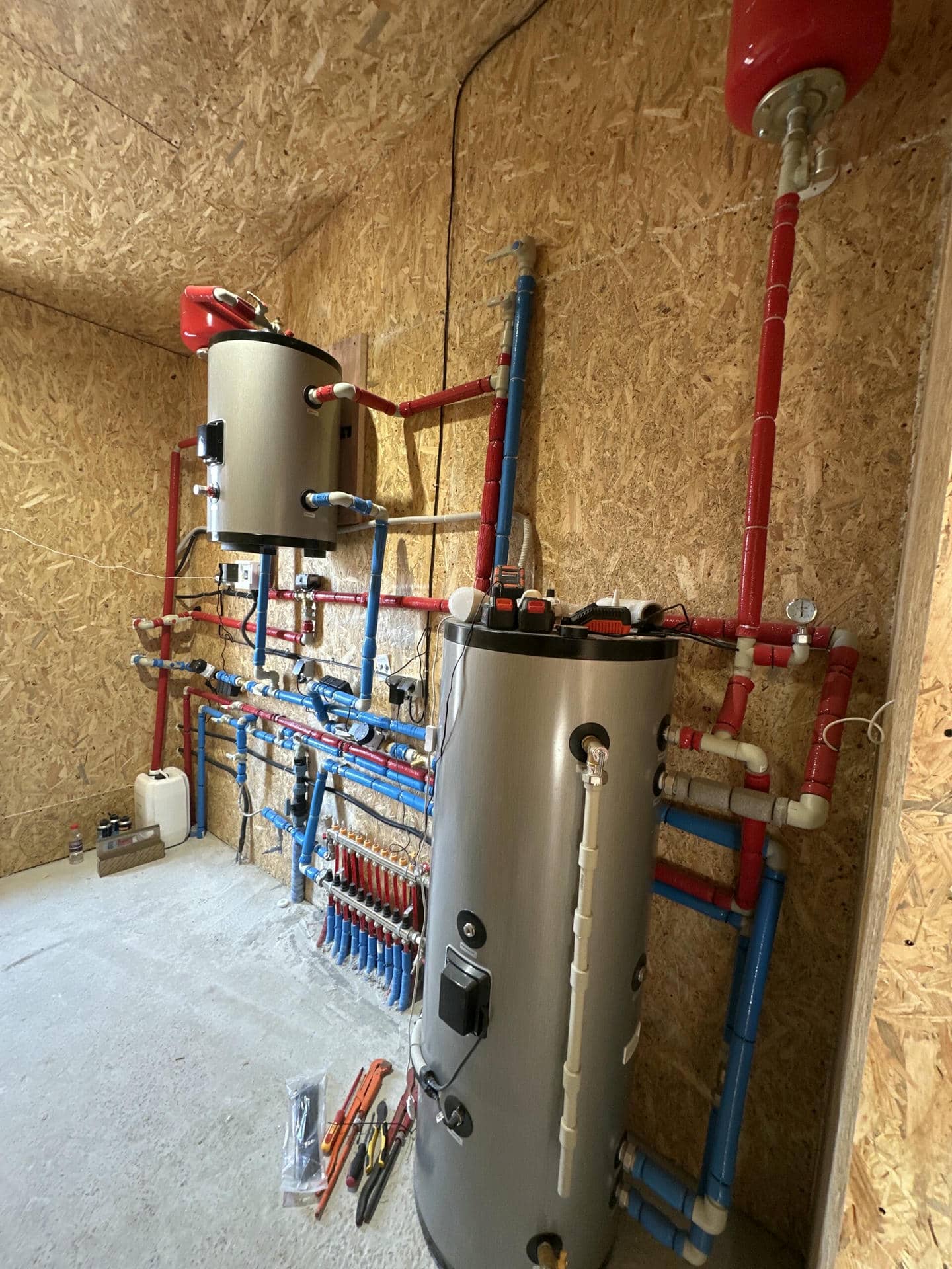 Бак ГВС интегрирован в систему теплого пола и общего отопления, что позволяет оптимально распределять тепло по помещениям. Такая конфигурация обеспечивает стабильное горячее водоснабжение и энергоэффективность использования тепловой энергии. Монтаж выполнен с учетом технических норм и правил безопасности, что гарантирует долговечность и надежность работы системы.