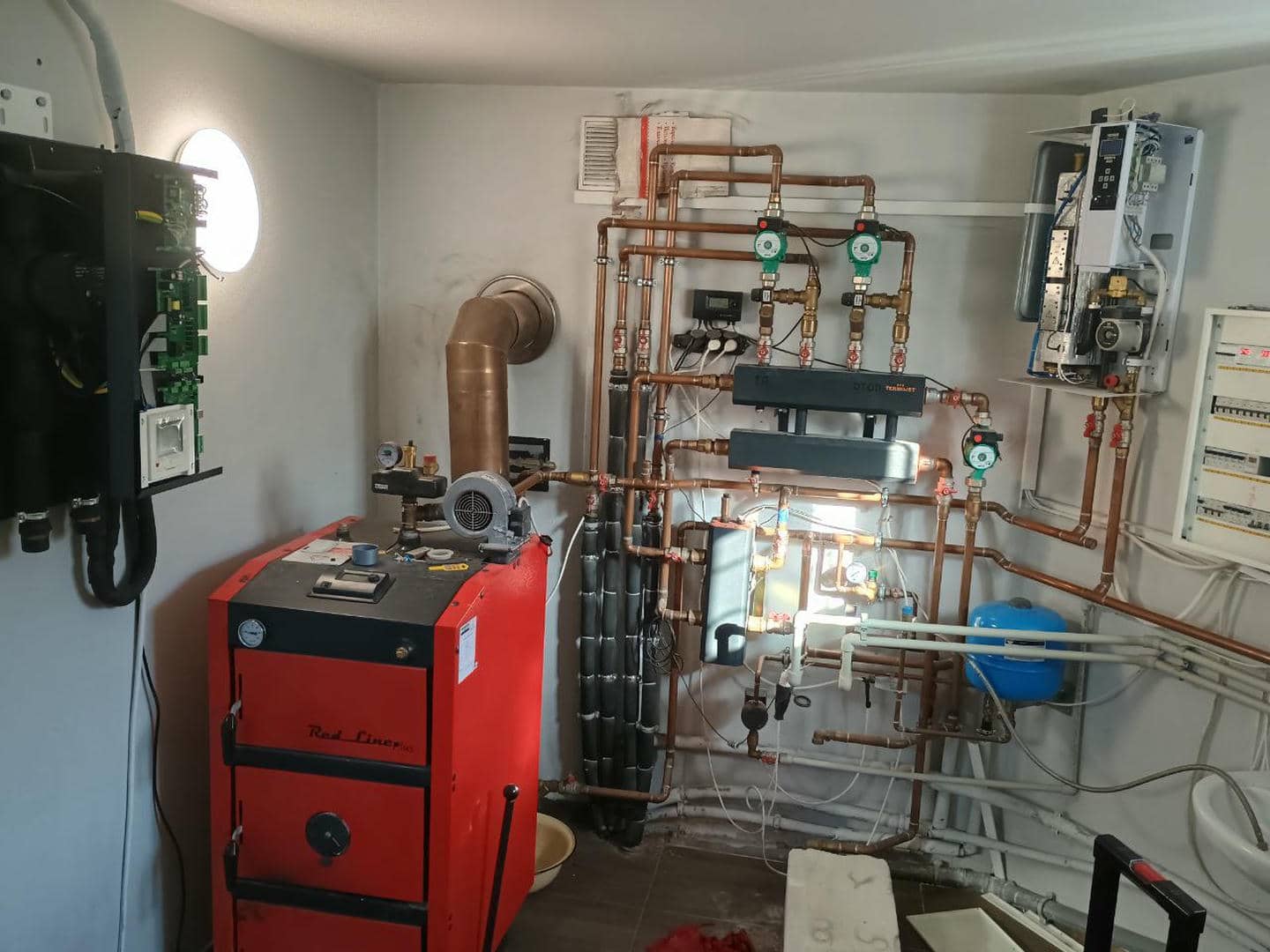 В процессе переоборудования системы отопления был демонтирован старый твердотопливный котел, на месте которого теперь смонтировано современное теплообменное оборудование — буферную емкость и бойлер косвенного нагрева (бак ГВС), которые работают в паре с тепловым насосом Mitsubishi Heavy HeatGuard 160NX.