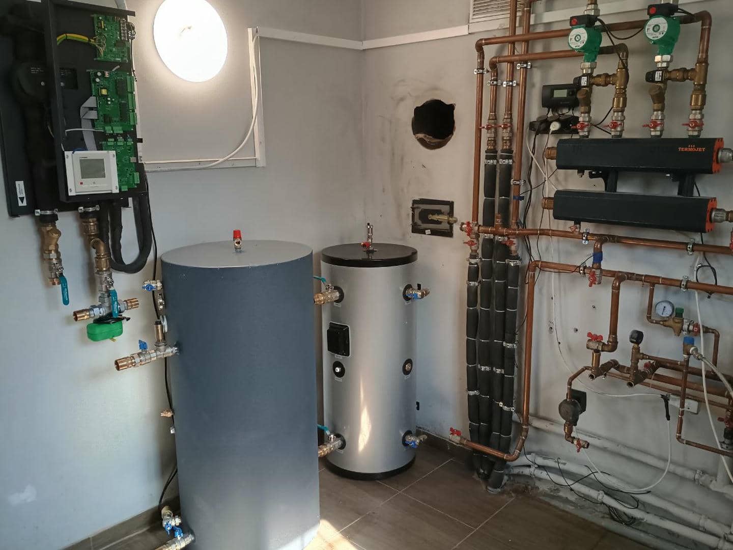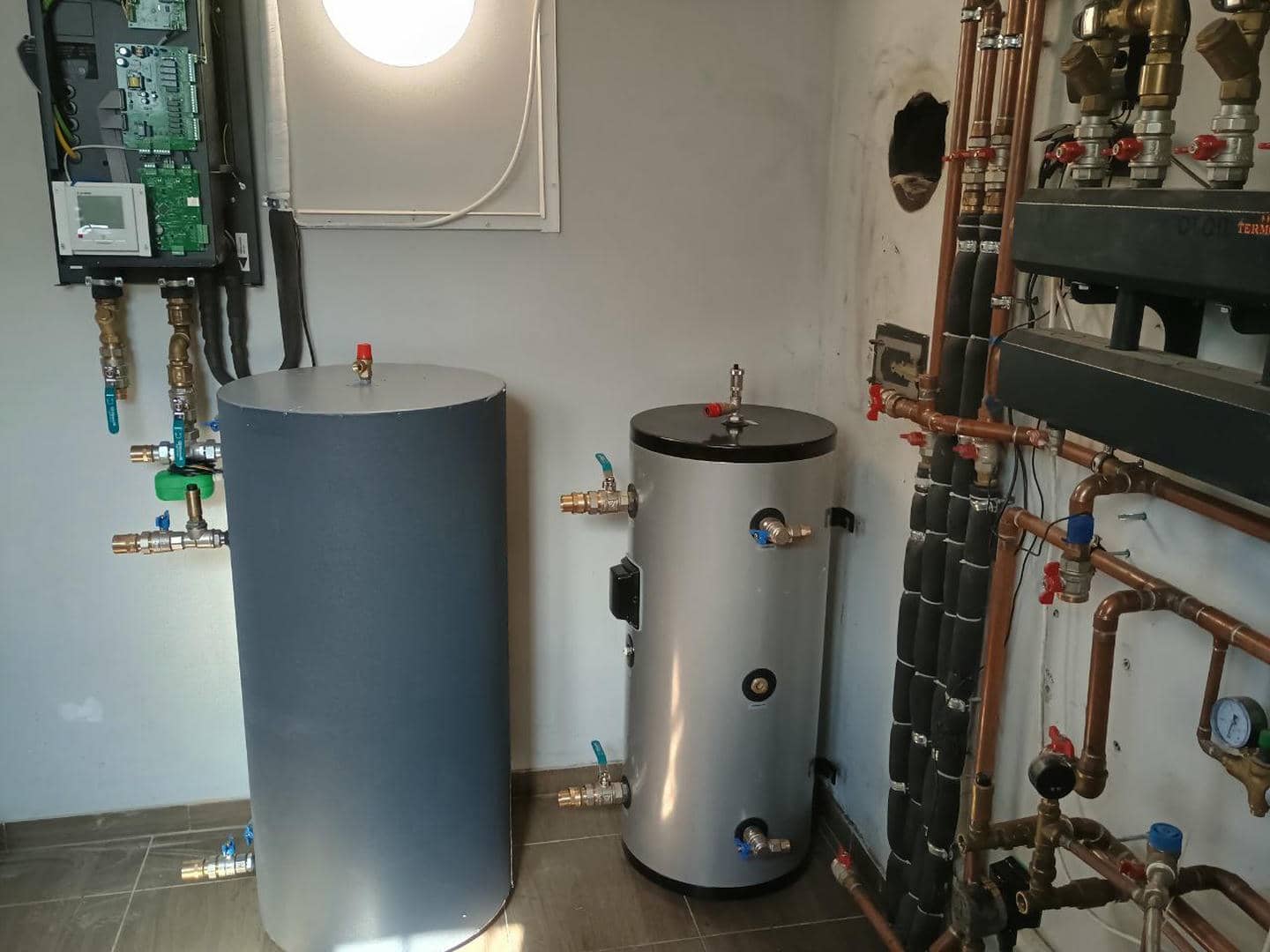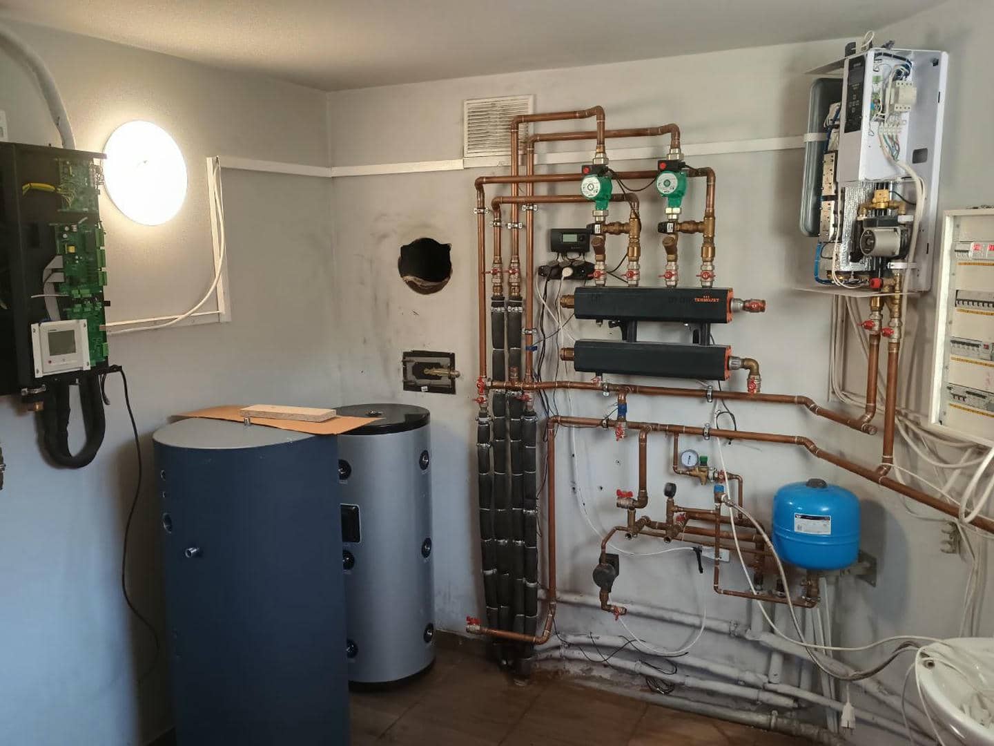 В процессе переоборудования системы отопления был демонтирован старый твердотопливный котел, на месте которого теперь смонтировано современное теплообменное оборудование — буферную емкость и бойлер косвенного нагрева (бак ГВС), которые работают в паре с тепловым насосом Mitsubishi Heavy HeatGuard 160NX.