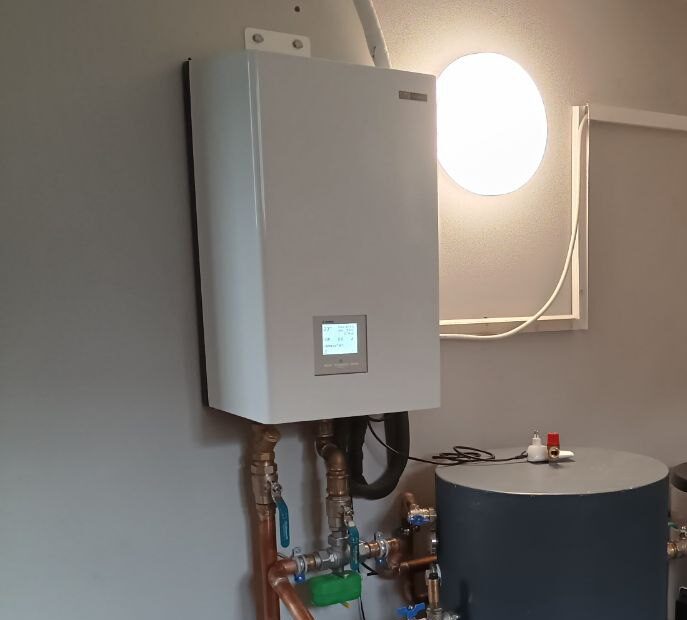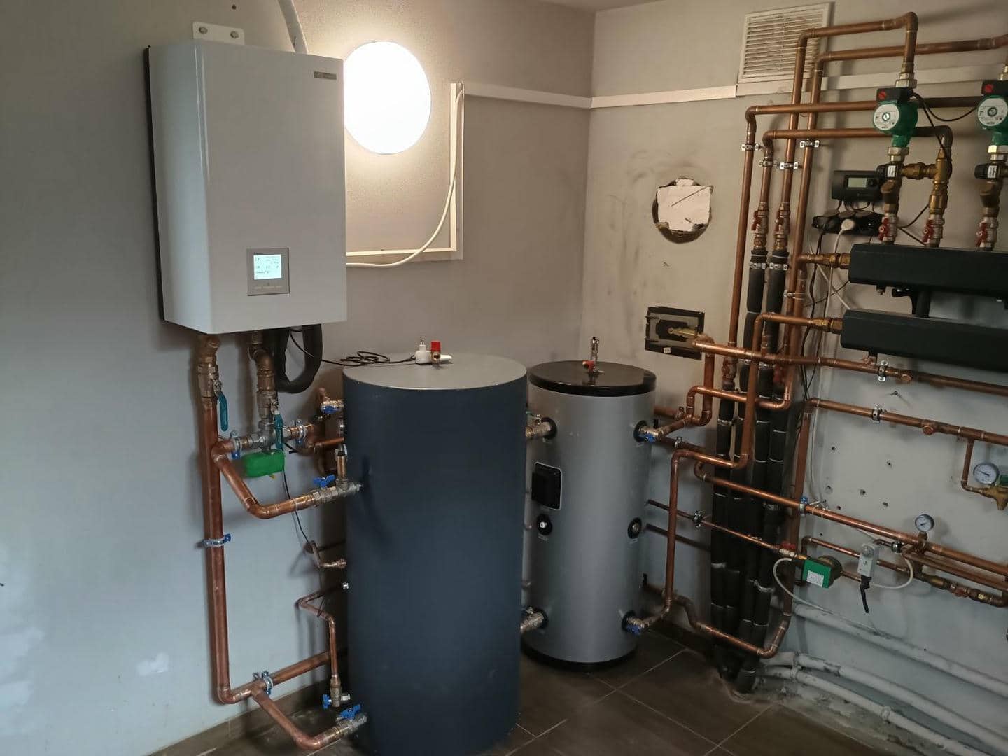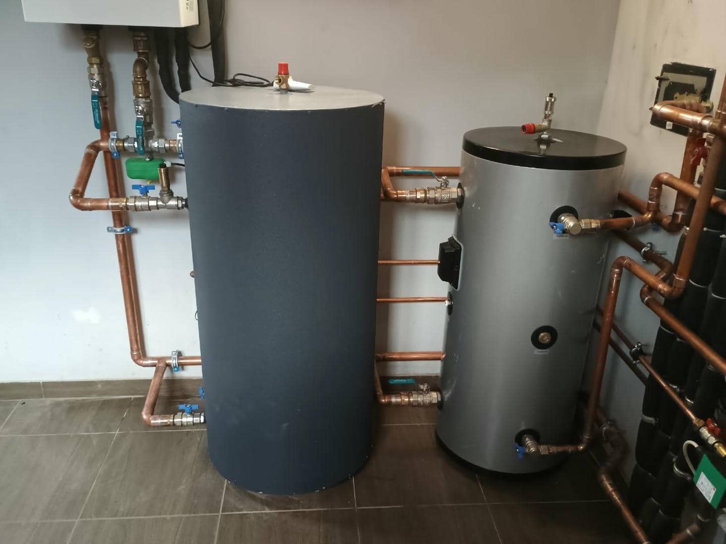 В процессе переоборудования системы отопления был демонтирован старый твердотопливный котел, на месте которого теперь смонтировано современное теплообменное оборудование — буферную емкость и бойлер косвенного нагрева (бак ГВС), которые работают в паре с тепловым насосом Mitsubishi Heavy HeatGuard 160NX.