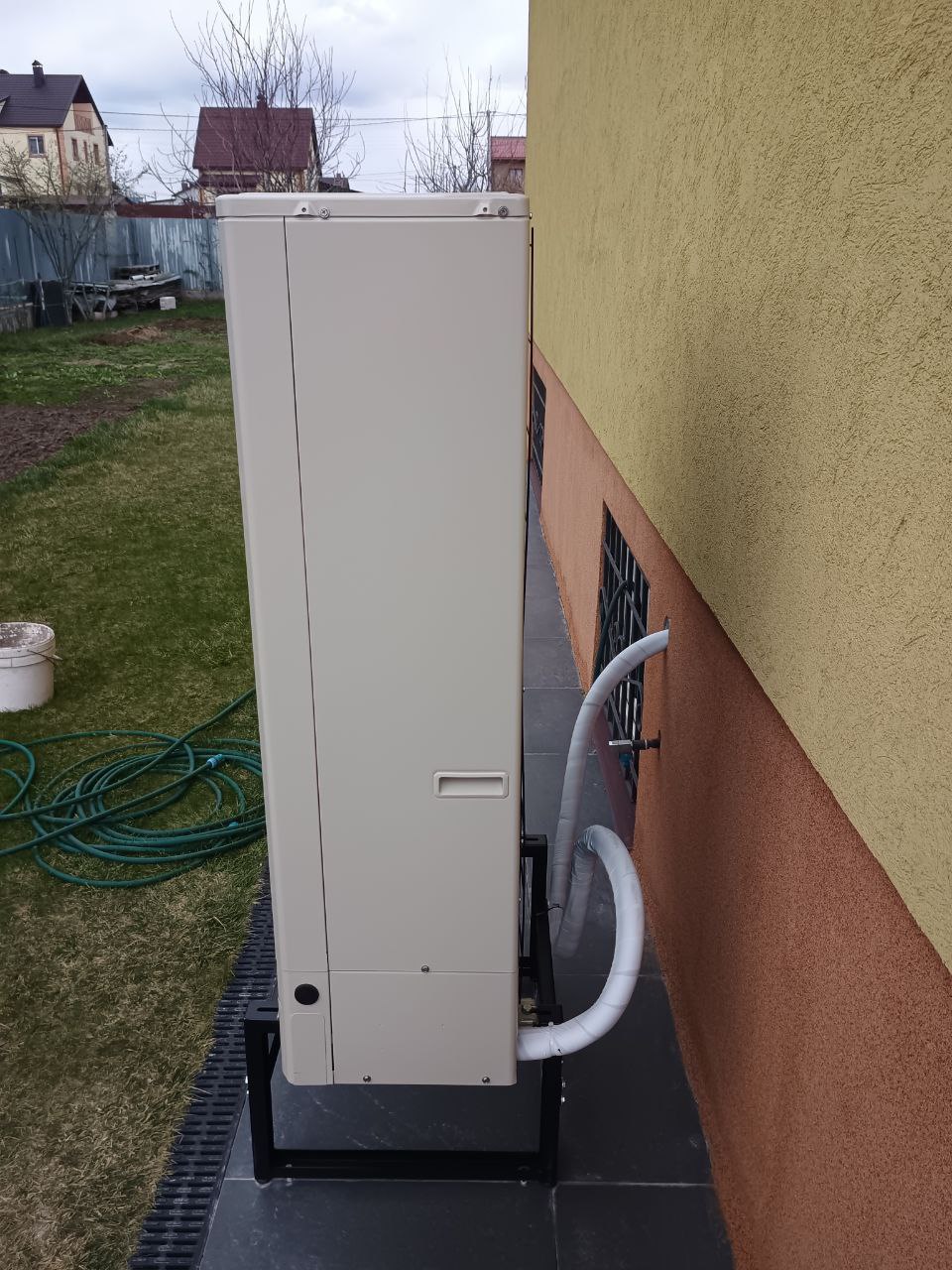 Для размещения наружного блока был выбран участок на северном фасаде дома с хорошей вентиляцией. Основание выровнено, установлена металлическая антивибрационная рама для поднятия блока над уровнем земли, защищающая от снега, грязи и осадков.
