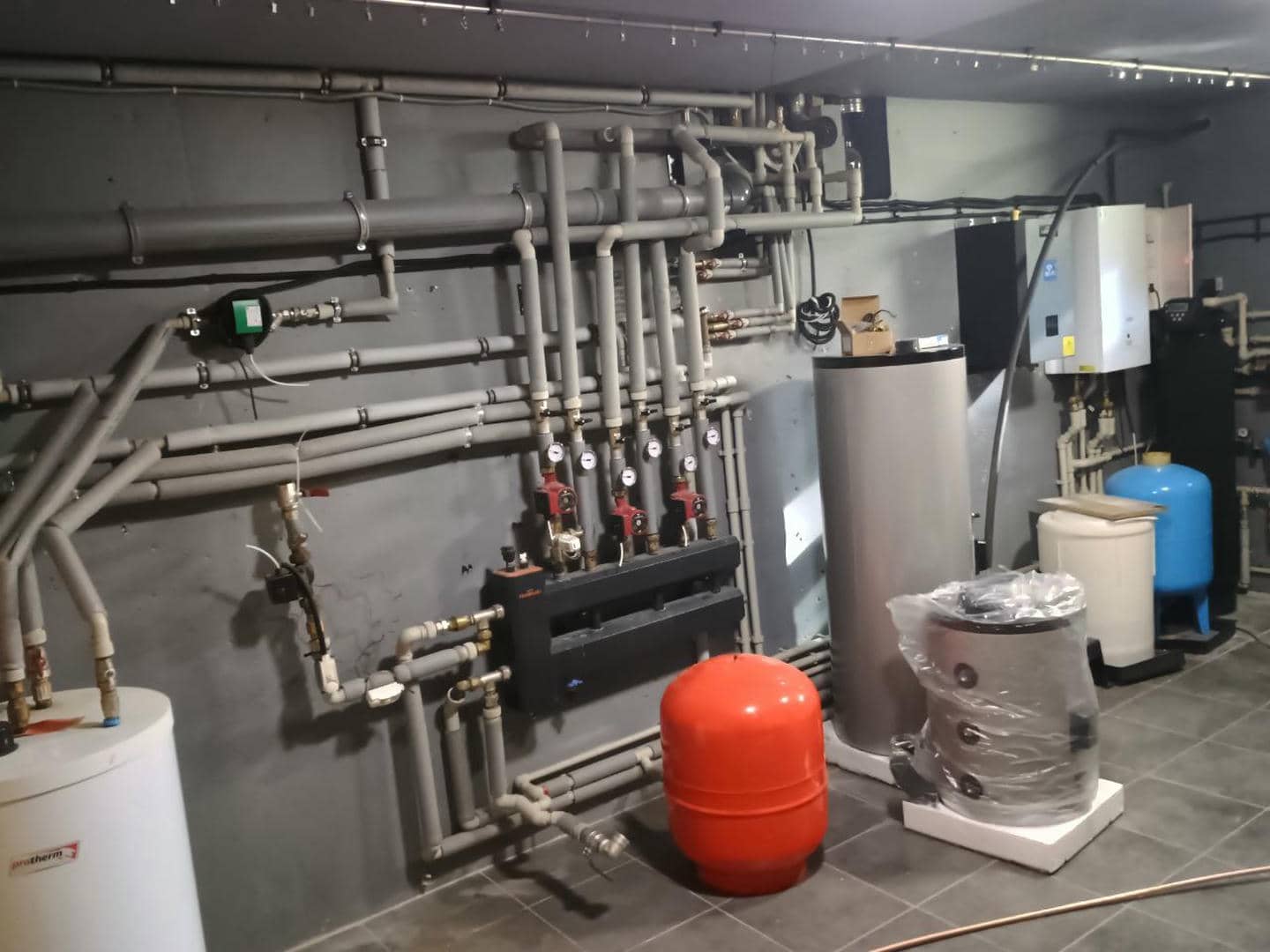 Гидравлический узел состоит из специального гидравлического разделителя (гидрострелки), в который входят подающие и обратные трубопроводы от теплового насоса, буфера и потребителей тепла (радиаторы, теплый пол, бойлер ГВС). К узлу подключено несколько циркуляционных насосов, которые отвечают за циркуляцию теплоносителя в различных ветвях системы. Также установлены развоздушители, запорная арматура, группа безопасности, манометры и расширительный бак, которые помогают поддерживать давление в системе на оптимальном уровне и контролировать ее работу.