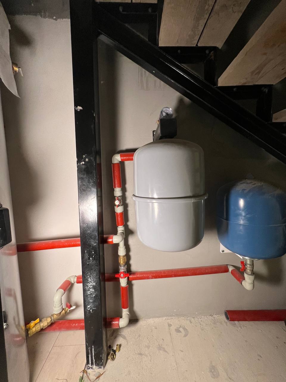 Для стабильной работы системы также были установлены расширительные баки на каждый из баков — отдельно для буферной ёмкости и отдельно для бойлера ГВС. Это позволяет компенсировать температурные колебания объёма воды в каждом контуре, предотвратить избыточное давление в системе и обеспечить бесперебойную работу оборудования.