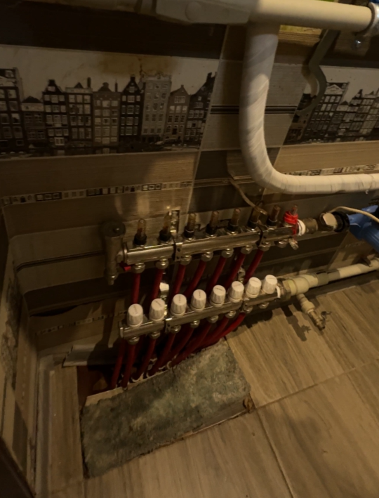Подключение выполнено по схеме подача/обратная, что позволяет равномерно распределять теплоноситель по всем контурам пола.