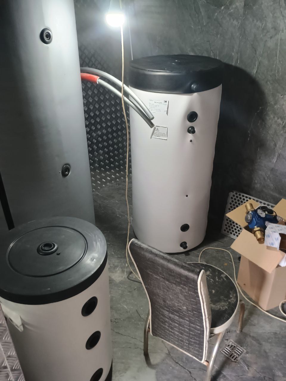Для горячего водоснабжения применён бойлер косвенного нагрева на 250 л, подключённый через трёхходовой клапан. Также предусмотрено прямое питание бака от электросети, что гарантирует наличие горячей воды даже в аварийных ситуациях. Дополнительно установлен расширительный бак, обеспечивающий стабильное давление и защиту системы.