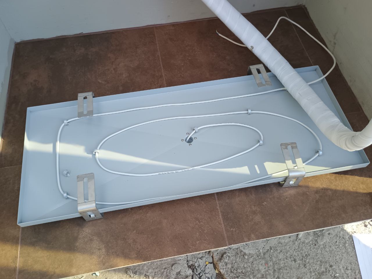 Особое внимание уделили защите оборудования от зимнего обледенения. Для этого смонтирован металлический поддон со встроенным нагревательным кабелем, который автоматически включается во время работы системы размораживания. Это предотвращает образование льда под блоком и гарантирует безопасную работу теплового насоса даже в сильные морозы.