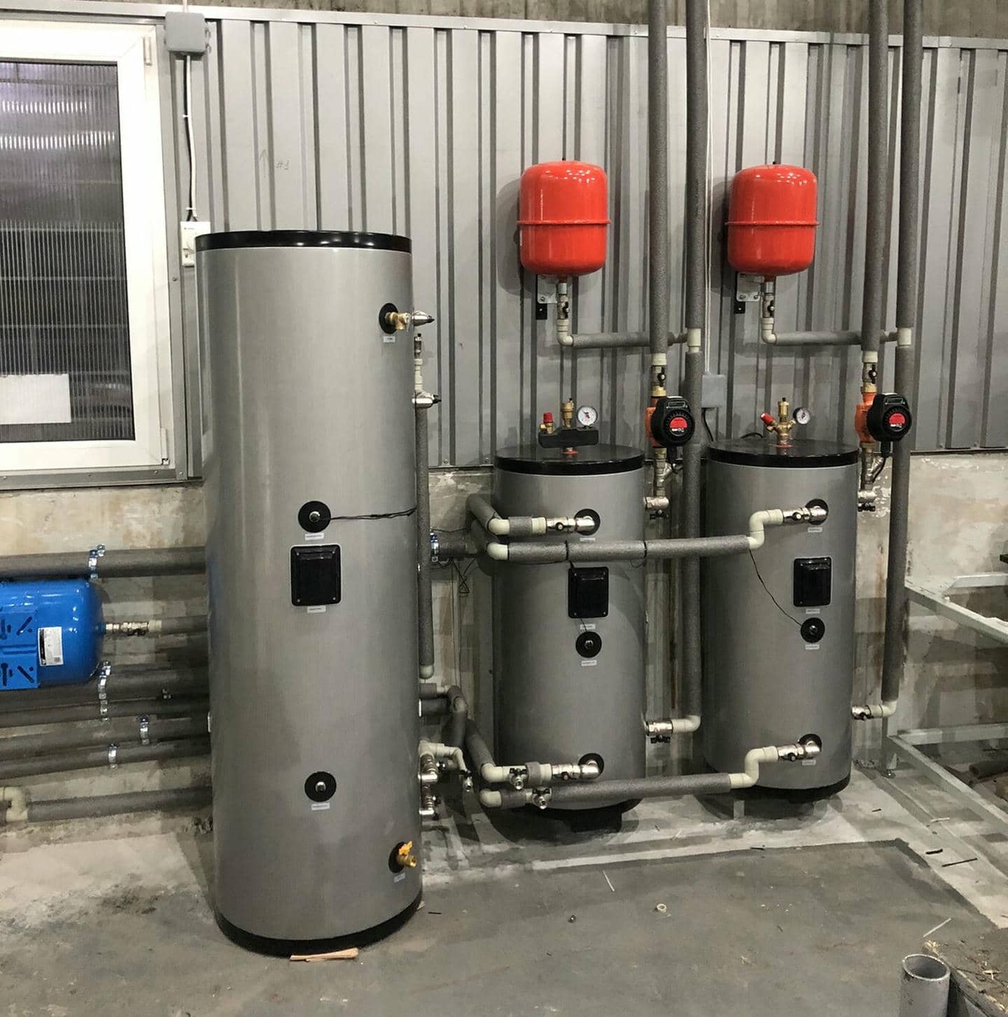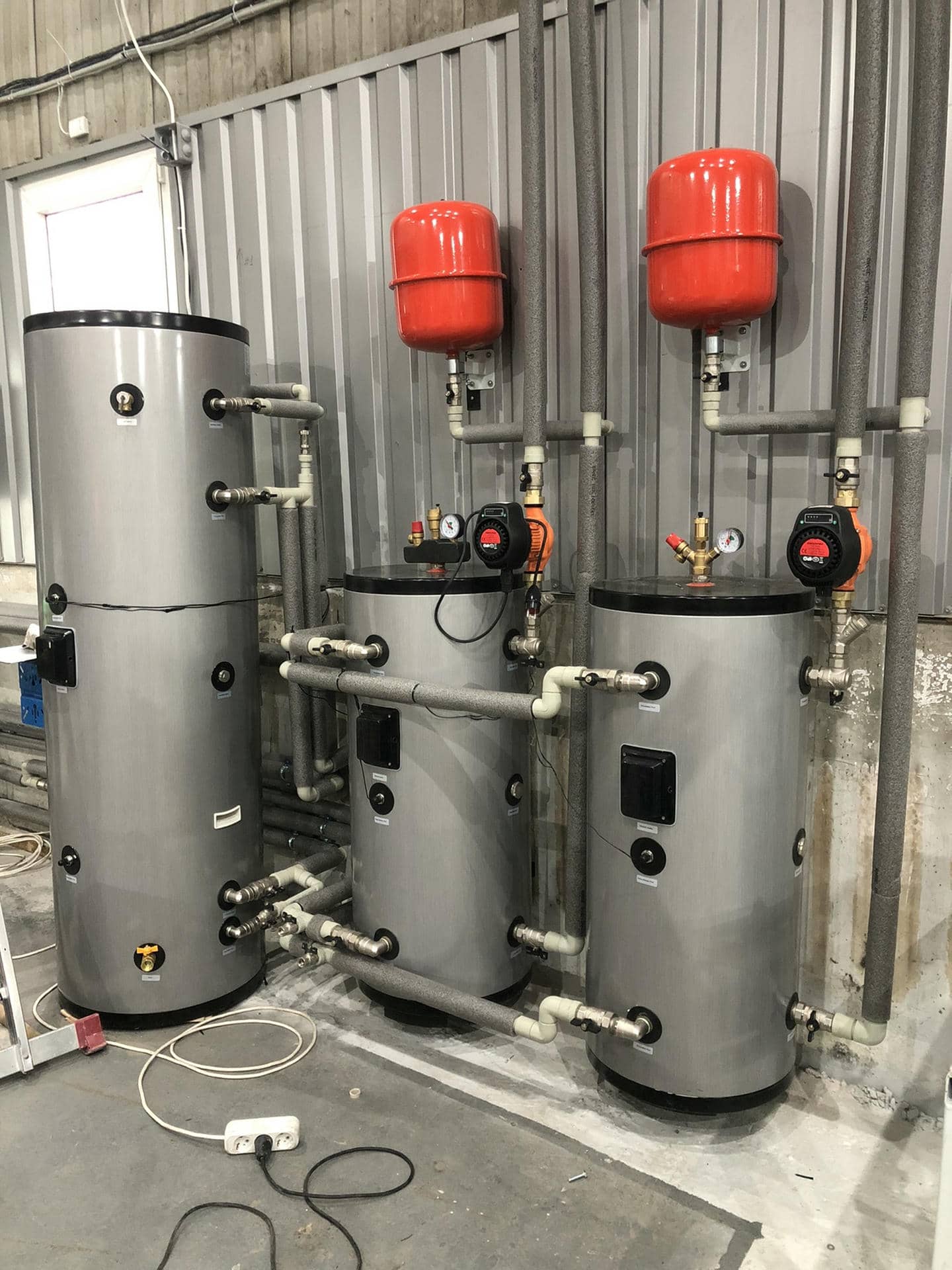 После завершения монтажа двух гидромодулей Raymer и их интеграции с буферными емкостями, следующим этапом стала инсталляция и подключение бака косвенного нагрева Raymer DHWP 300L. Основное назначение этого бака — обеспечение бесперебойного горячего водоснабжения для нужд производственного цеха площадью 600 м², а также оптимизация эффективности работы тепловых насосов.