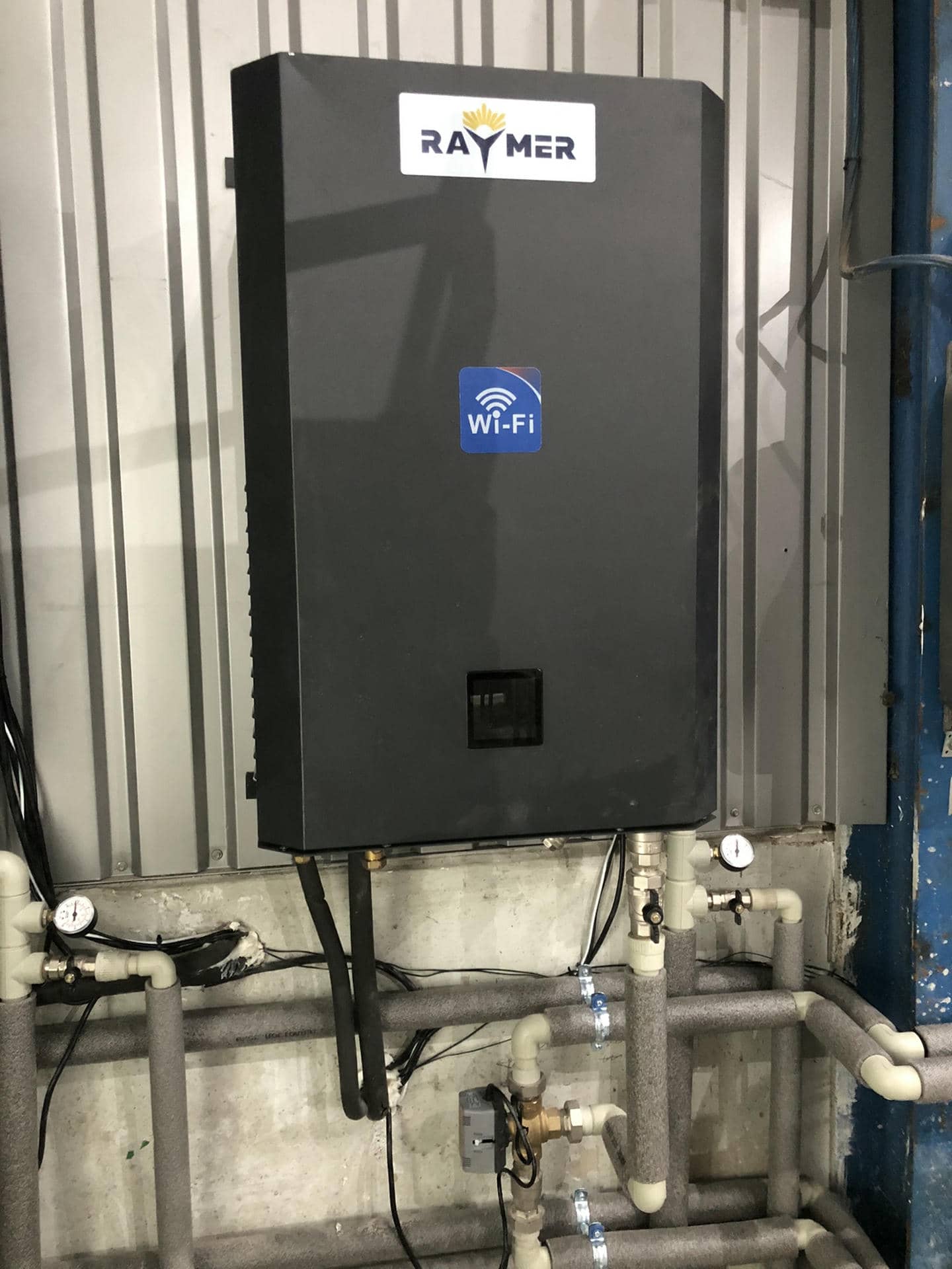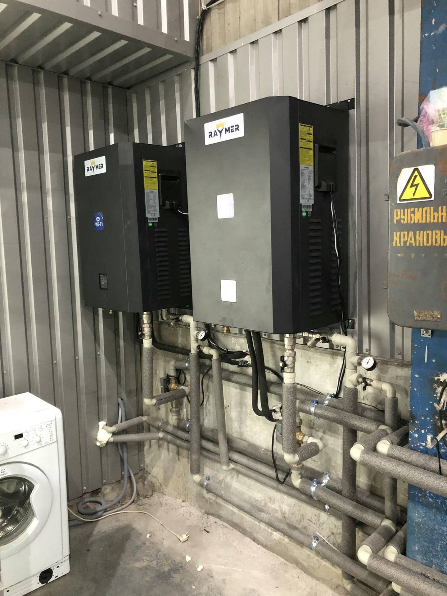Для реализации проекта была выбрана каскадная схема монтажа двух тепловых насосов Raymer RAY-24DS2-EVI (380V) black. Эта модель обеспечивает высокую энергоэффективность и стабильную работу даже при низких температурах, что критически важно для большого производственного помещения.
