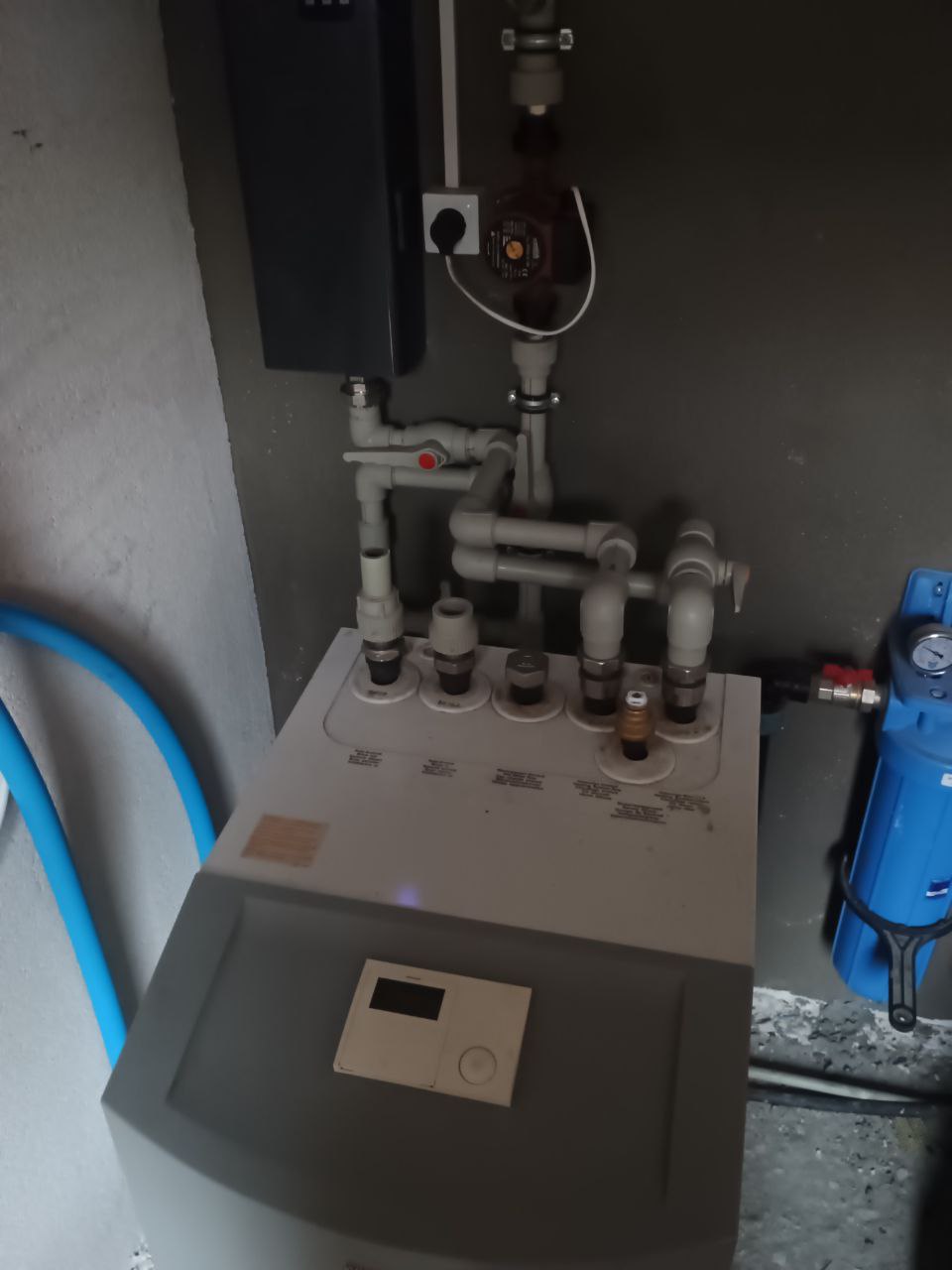 Після встановлення зовнішнього обладнання та буферної ємності розпочато монтаж внутрішнього блоку теплового насоса Stiebel Eltron WPF, який розміщено в технічному приміщенні будинку. Обладнання встановлено на підготовлену рівну поверхню з дотриманням усіх вимог щодо вентиляції та доступу для обслуговування.