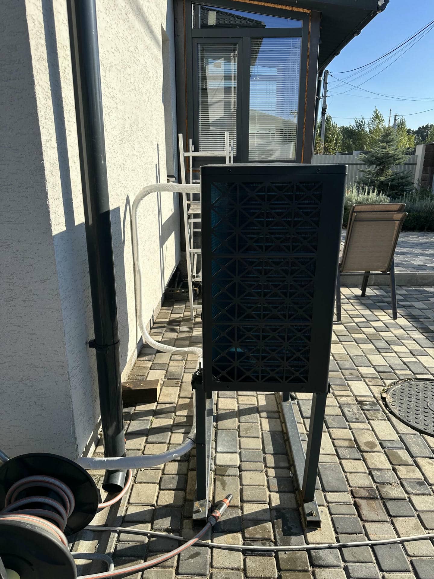 Наружный блок важно было установить на открытом воздухе, чтобы наружный блок имел доступ к воздуху, что обеспечивало бы достаточную вентиляцию и не мешало движению воздуха через теплообменник.
