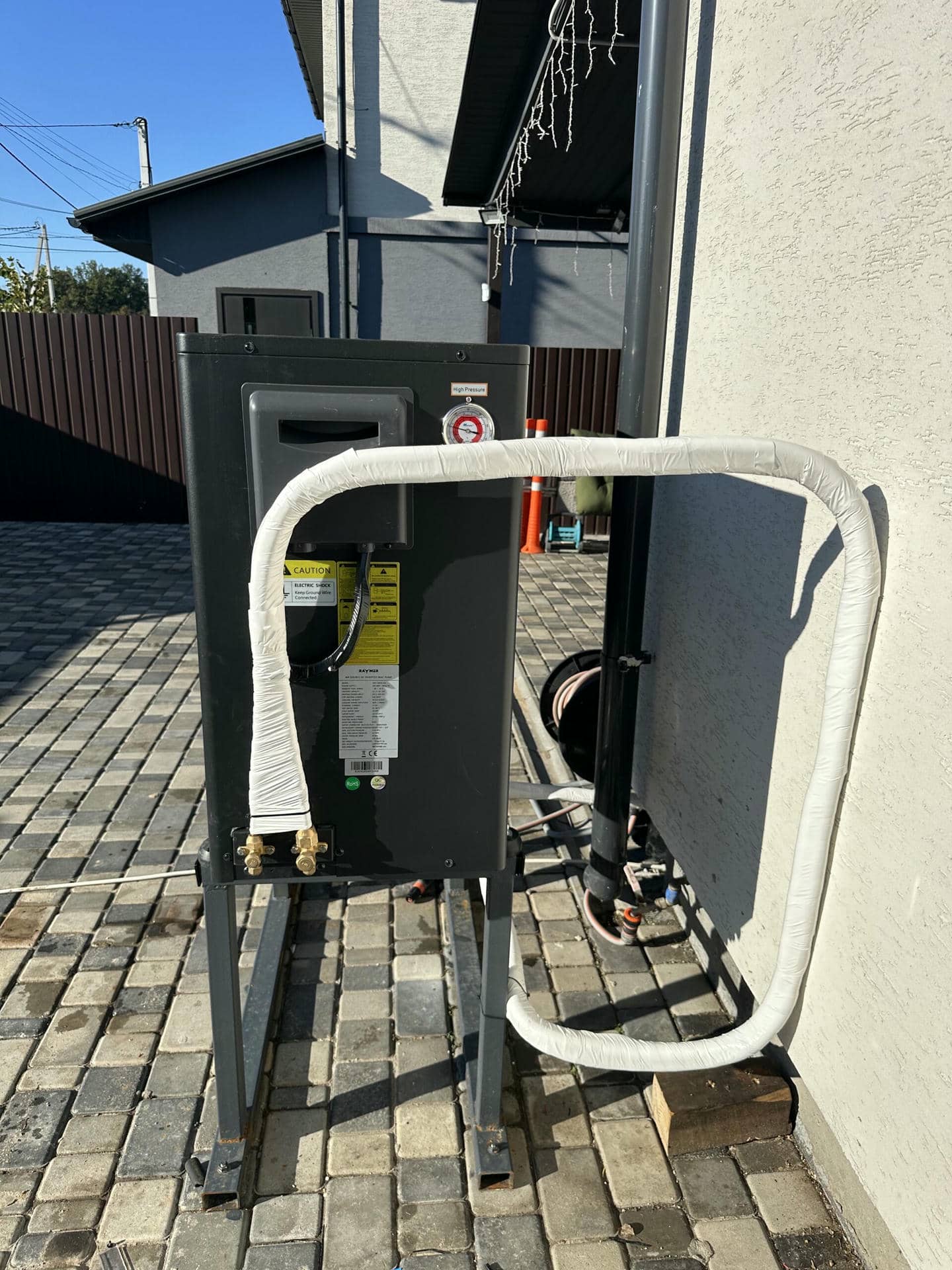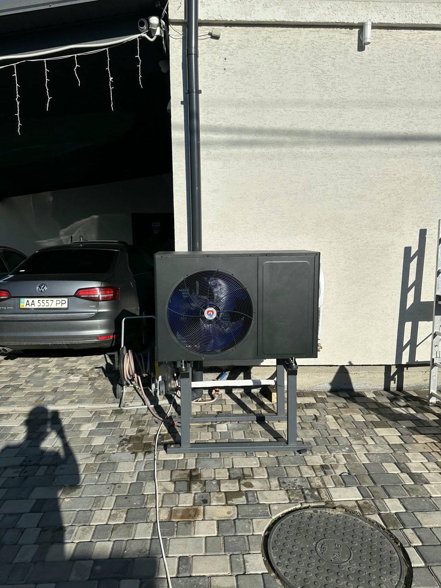 Наружный блок теплового насоса установлен на самостоятельно сваренную подставку и антивибрационные ножки, для уменьшения влияния вибрации от бетонной поверхности при работе компрессора и вентилятора.