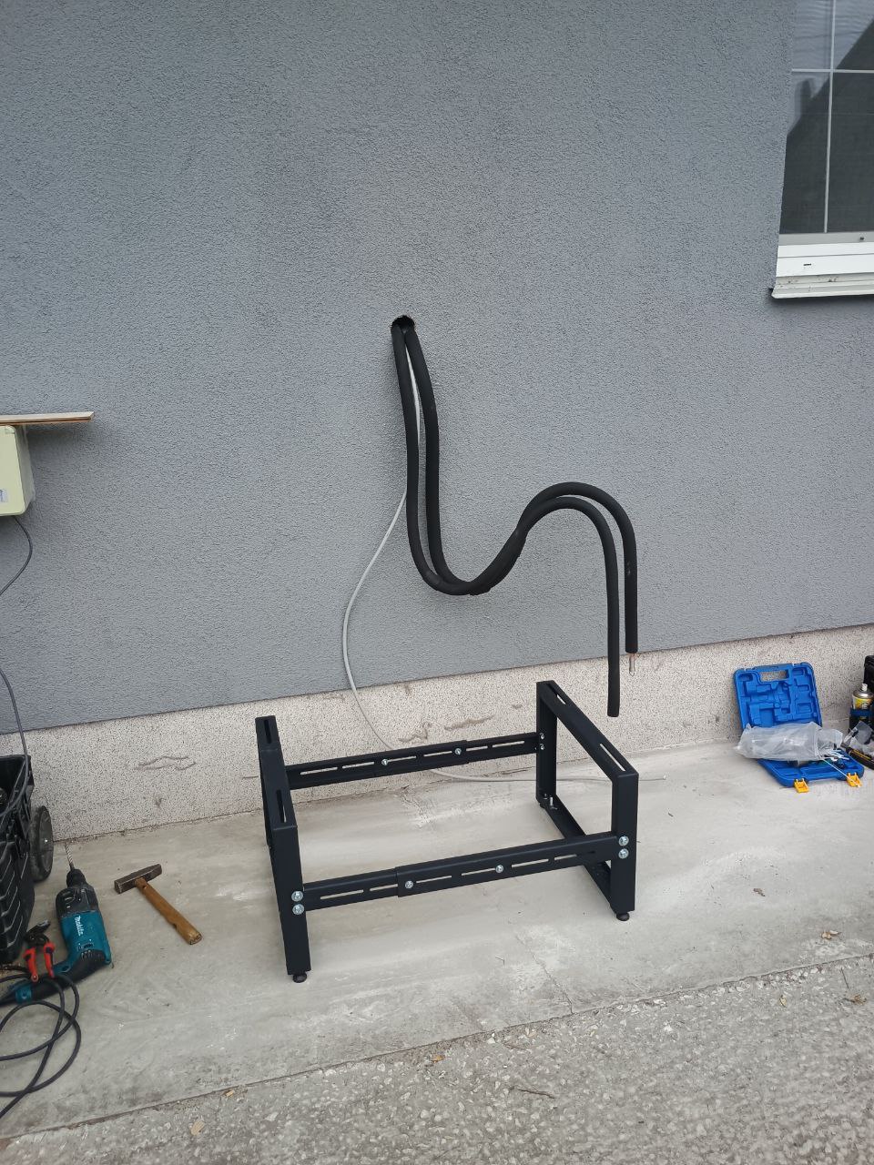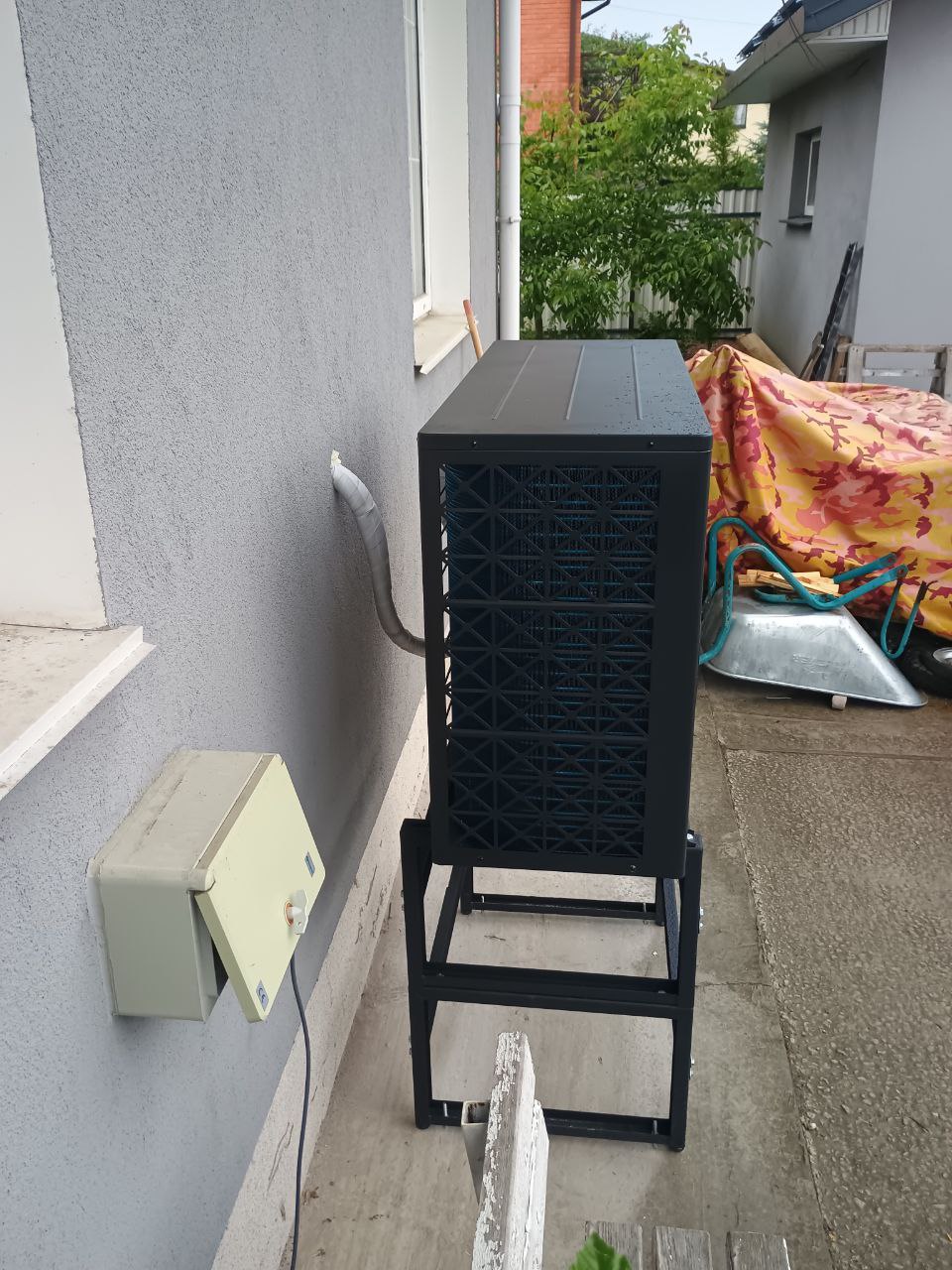На следующем этапе был смонтирован внешний блок теплового насоса Raymer RAY-10DS2-EVI. Сначала агрегат был установлен на стандартную низкую металлическую подставку, которая обеспечивала стабильность и соблюдение требований по минимальной высоте над землей. Такой вариант был технически приемлем, однако после оценки внешнего вида фасада дома было принято решение поднять блок еще на один уровень.
