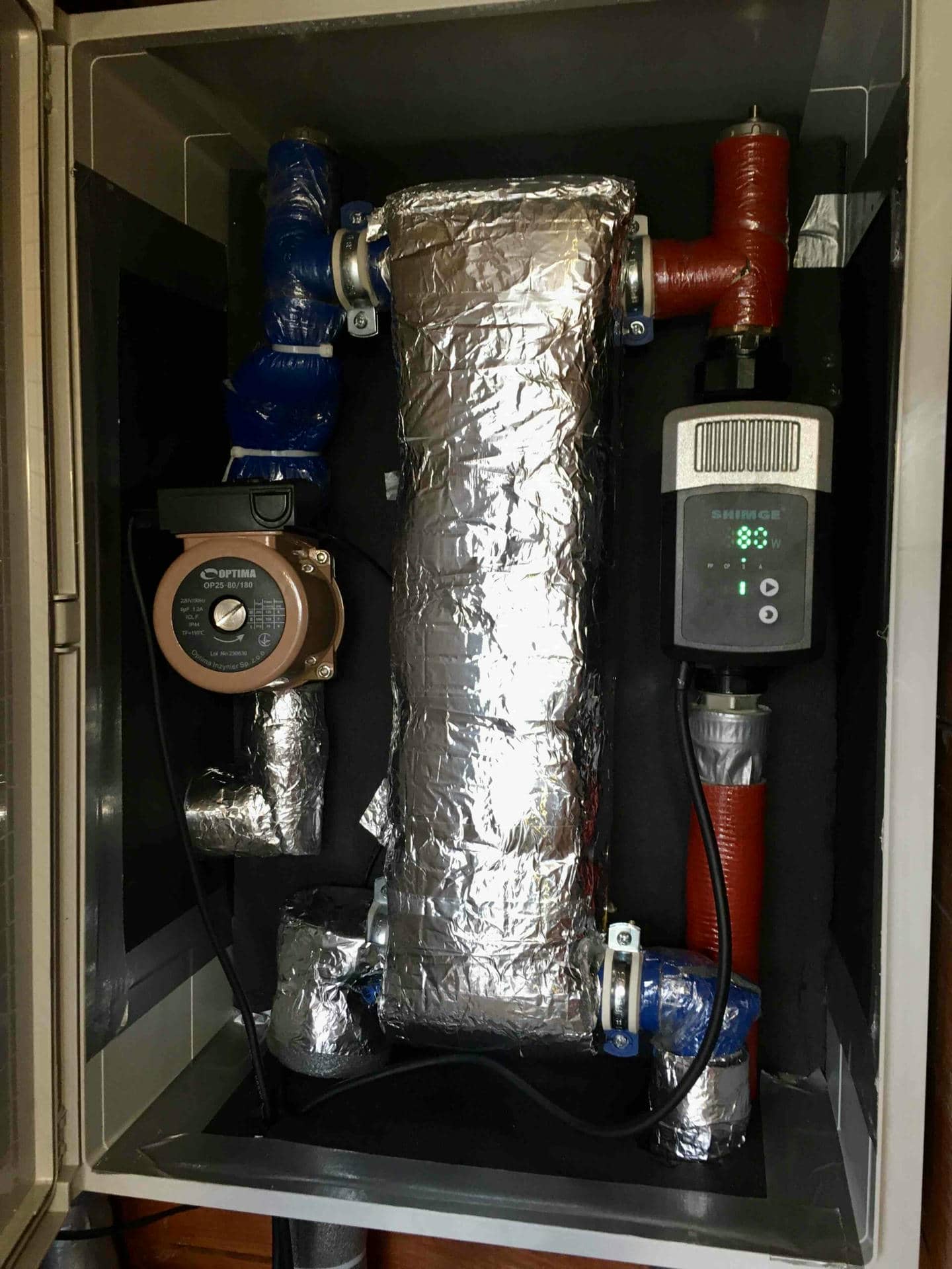 Была использована тепловая изоляция для труб, соединений к тепловому насосу, чтобы избежать теплопотерь. Также было установить промежуточный расширенный теплообменник для защиты системы от оттаивания и разделения жидкостей (спиртовой раствор/очищенная вода).
