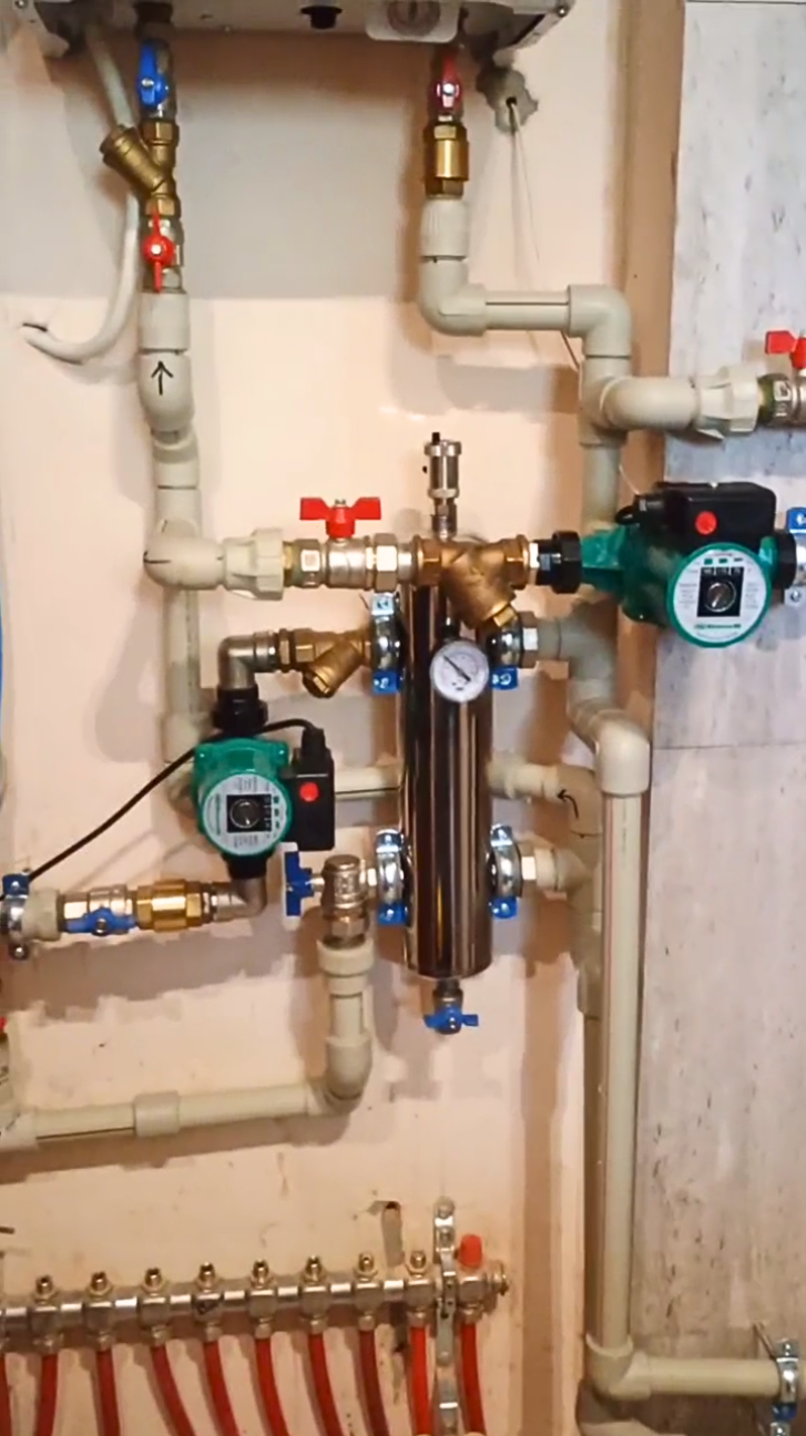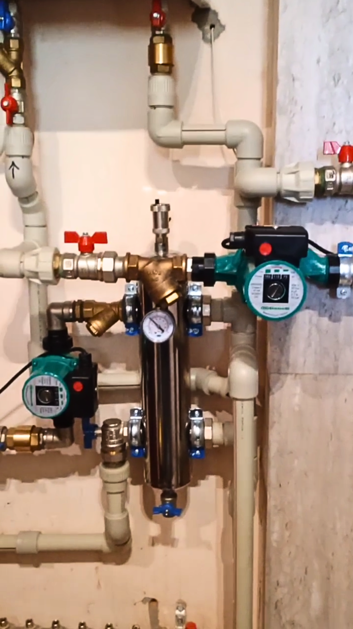 Гидравлическая стрелка позволяет балансировать систему отопления, равномерно распределяя теплоноситель по всем контурам. Это особенно важно при наличии нескольких источников тепла, таких как электрокотел, тепловой насос вода-вода и новый инверторный тепловой насос. Насосная группа была интегрирована для эффективного управления потоками теплоносителя между различными частями системы.