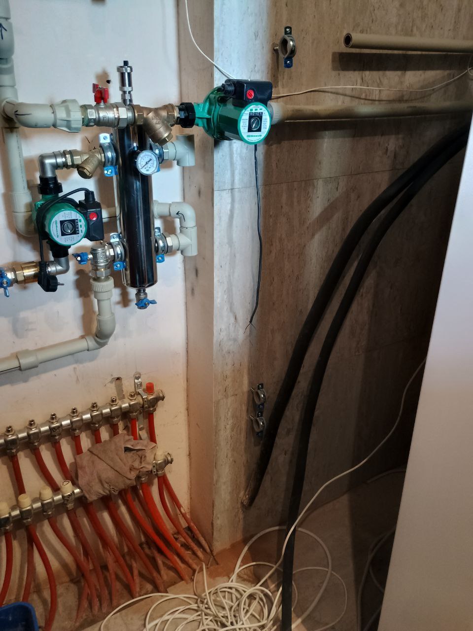 Трубы были разведены ко всем необходимым точкам: радиаторам и теплым полам. Это обеспечивает равномерное распределение тепла по всему дому, что особенно важно для комфорта проживания. Дополнительно был подключен бойлер, который поставляет горячую воду для бытовых нужд.