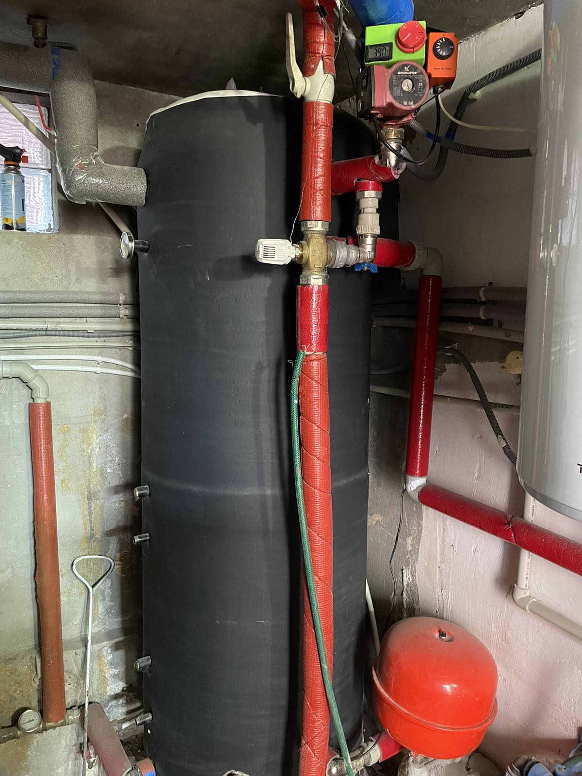 Была подключена буферная емкость на 500 литров, которая играет важную роль в системе отопления. Она позволяет накапливать излишки тепла и использовать их по мере необходимости, что повышает эффективность системы и обеспечивает равномерное отопление.