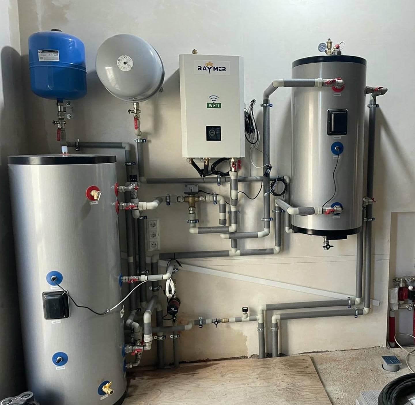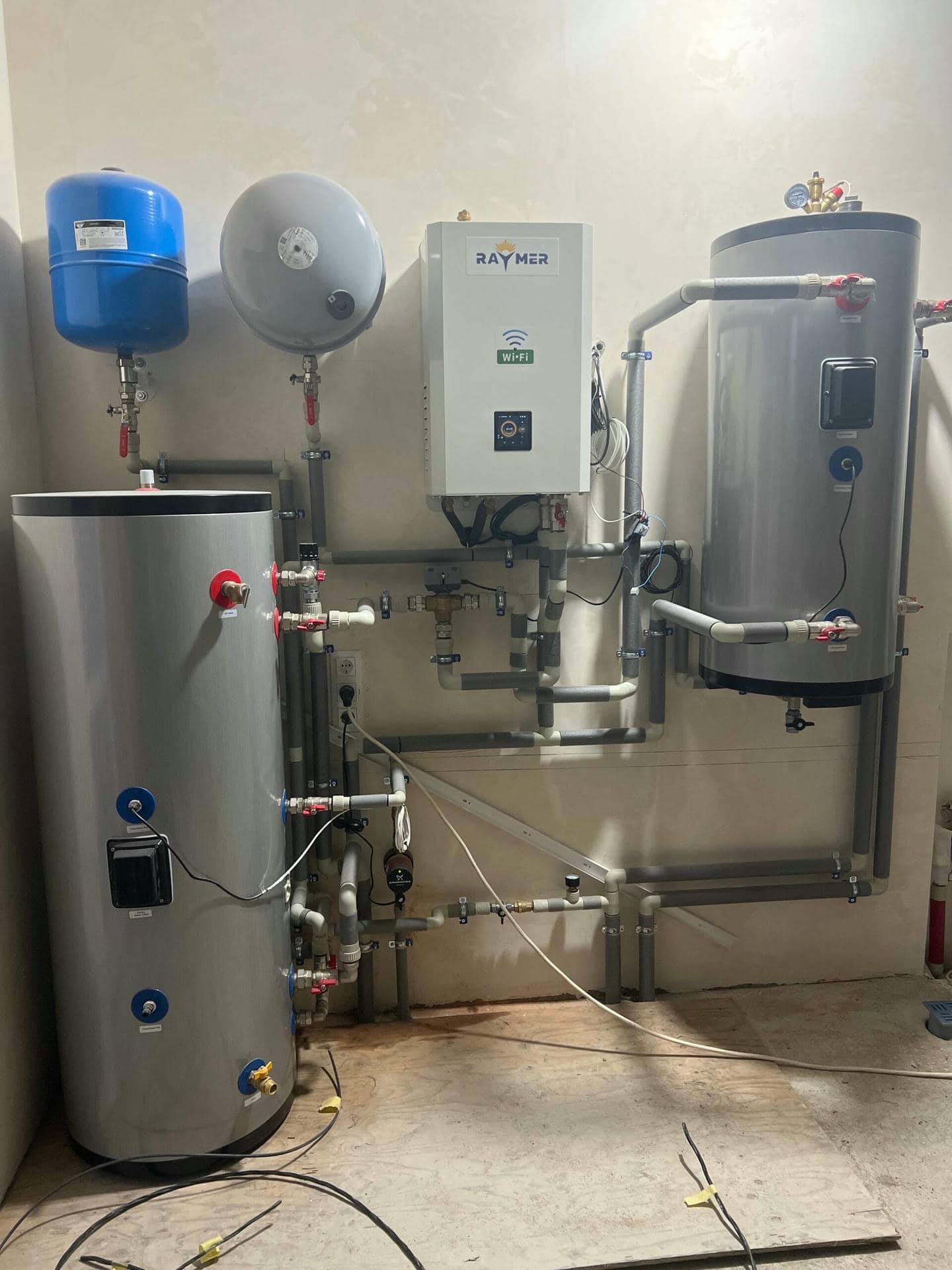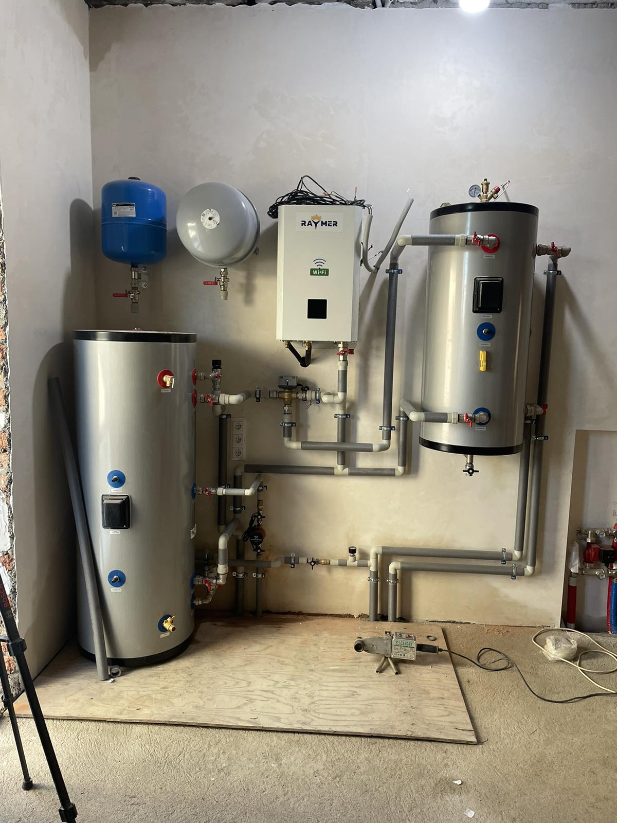 2. Установка дополнительного оборудования: Для создания полноценной системы отопления и горячего водоснабжения мы также провели установку дополнительного оборудования. Это включало в себя установку бака косвенного нагрева Raymer DHWP на 200 литровбака-накопителя Raymer IMP на 100 литров и трехходового клапана Raymer 325 ТВ. Все эти компоненты были профессионально установлены и подключены к системе теплового насоса.