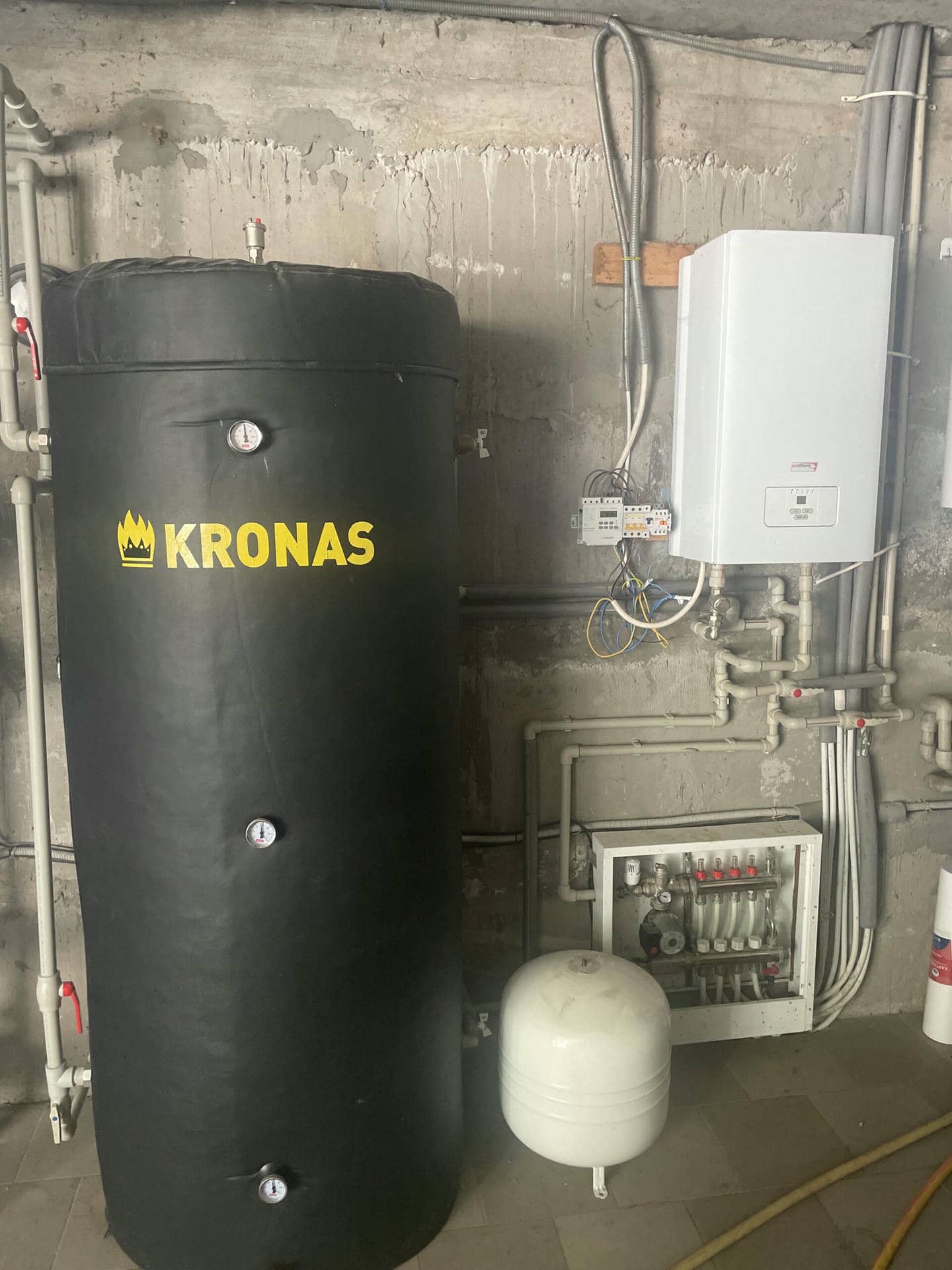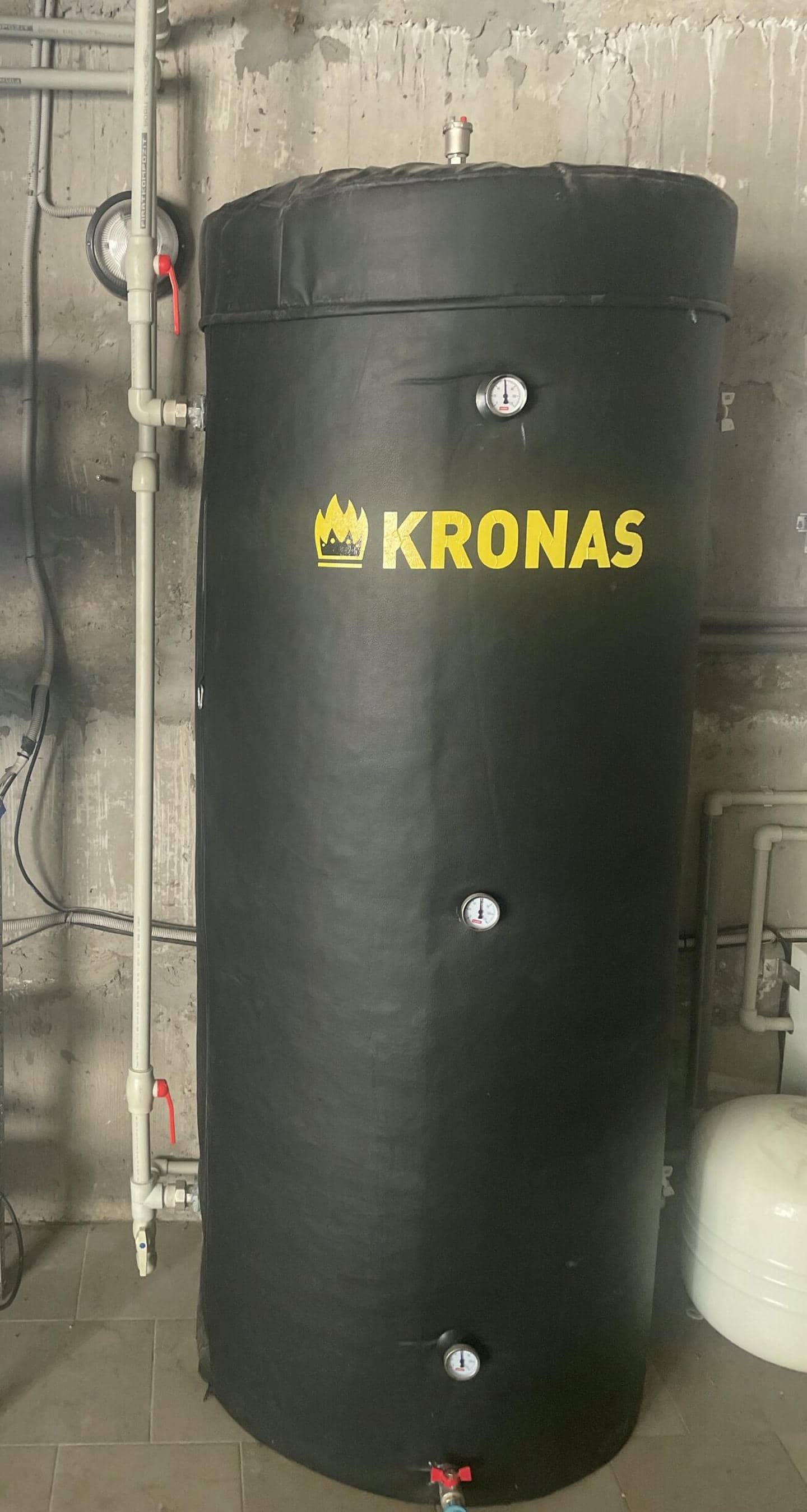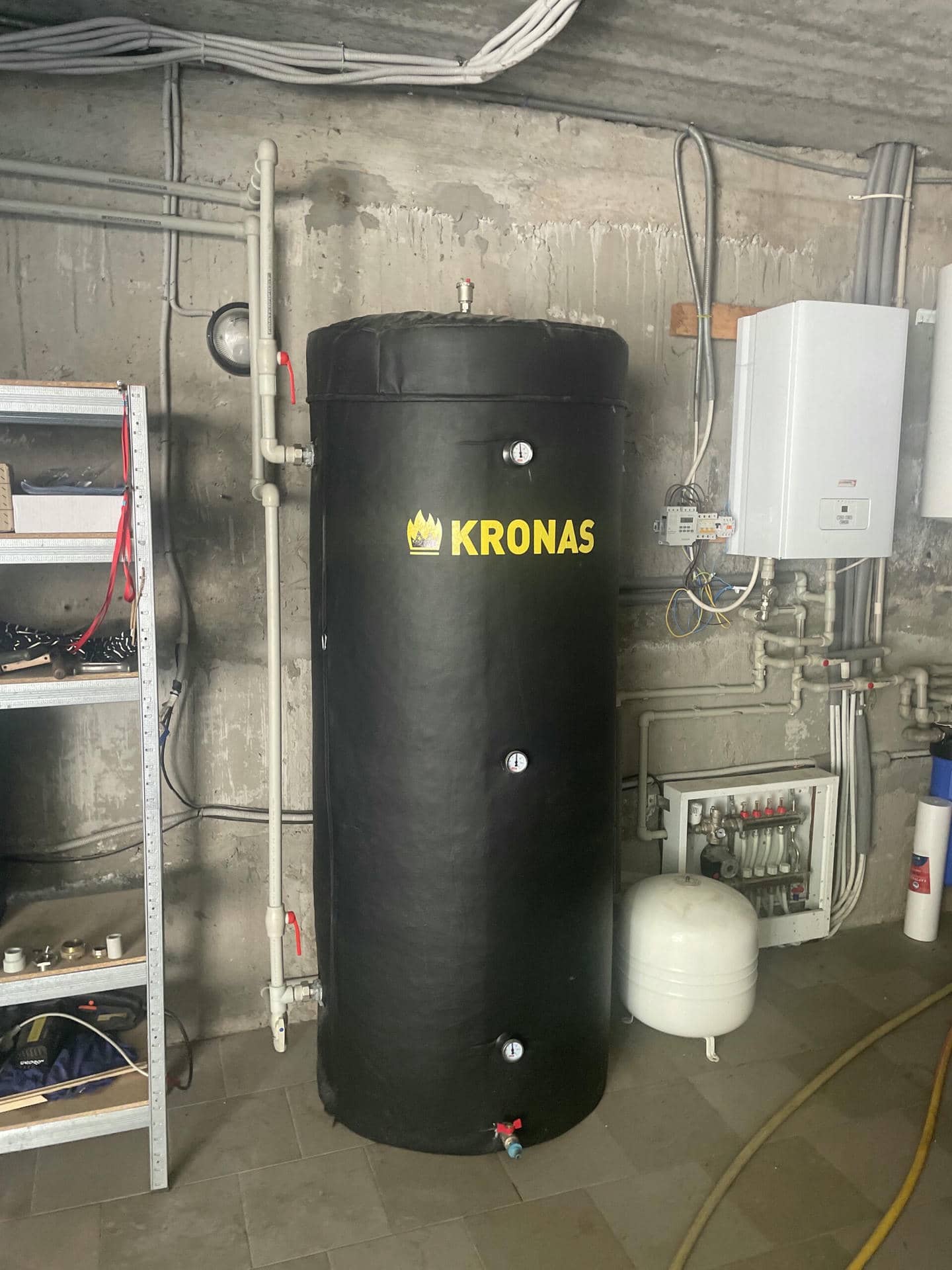 Тепловой насос был подключен к буферной емкости, которая уже была установлена вместе с электрическим котлом. Это решение позволяет эффективно комбинировать работу теплового насоса и электрокотла для обеспечения бесперебойного теплоснабжения.