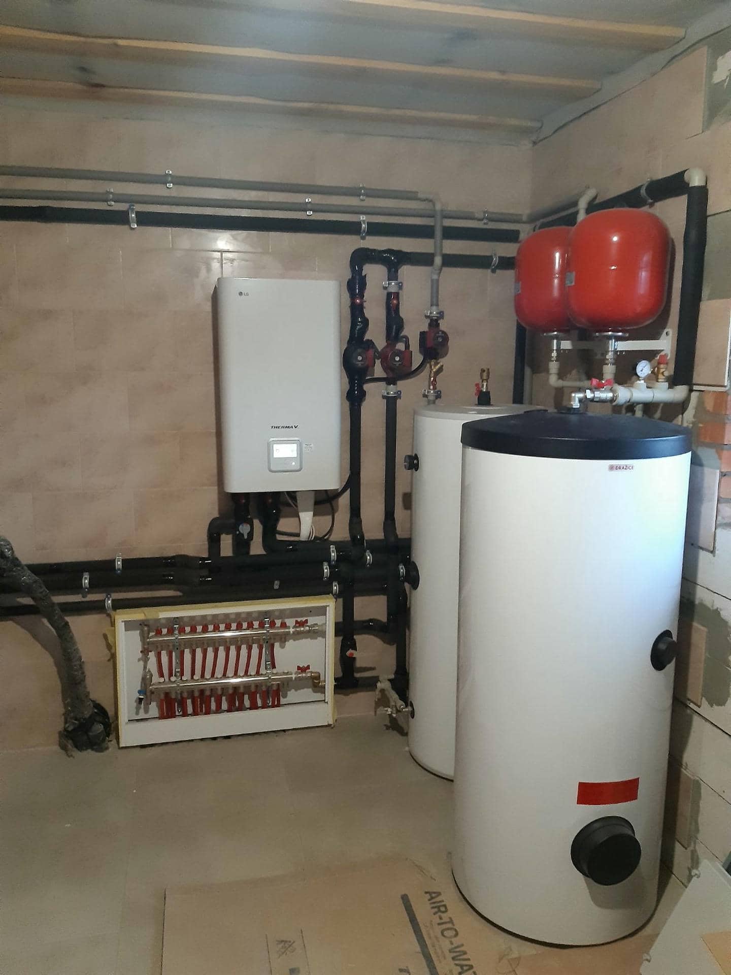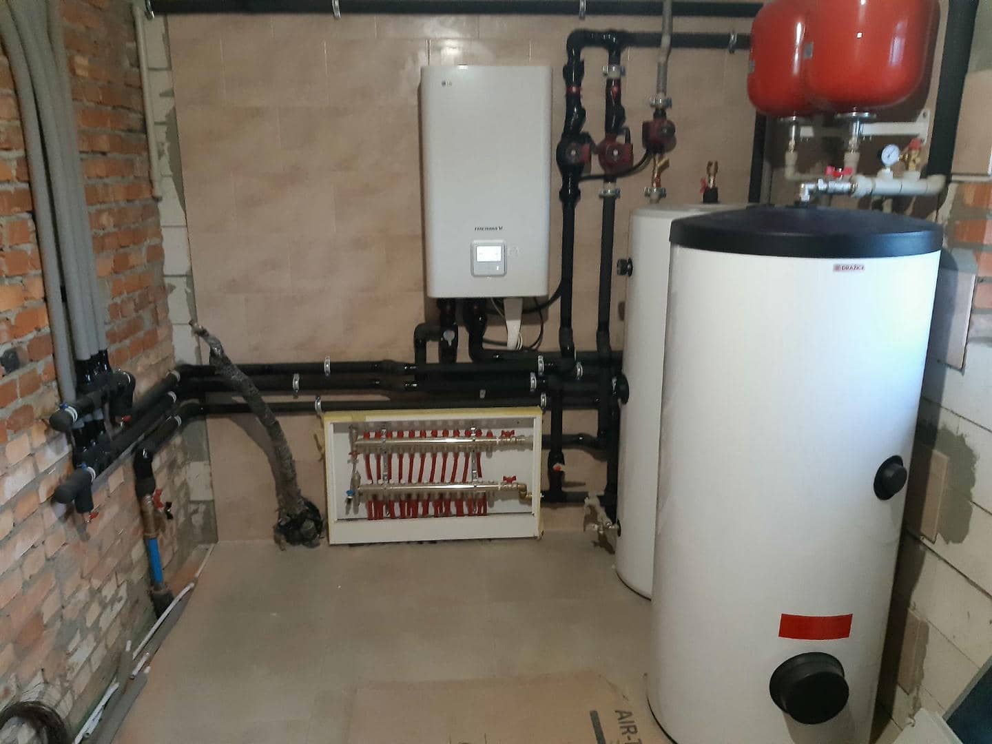 - Обустройство бойлерной, включая размещение гидромодуля (внутренний блок теплового насоса LG), бака-накопителя на 200 литров и бака ГВС также на 200 литров.