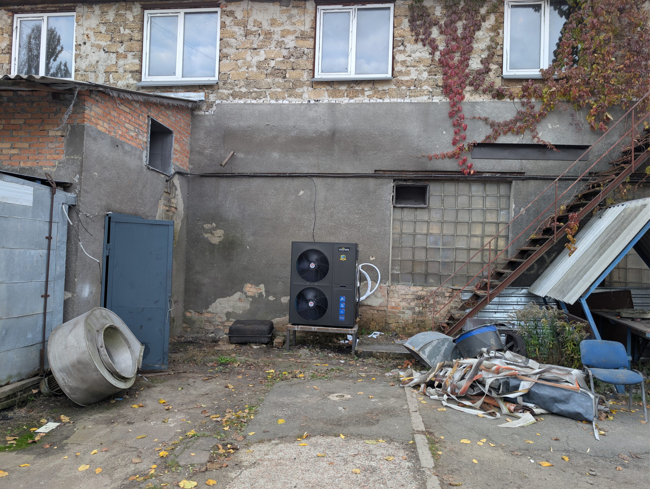 Зовнішній блок теплового насоса Raymer RAY-18DS2-EVI було встановлено на подвір’ї біля головного входу до виробничого цеху. Це місце обрали не випадково — воно забезпечує зручний доступ для сервісного обслуговування, достатній повітрообмін і безпечну відстань від робочих зон підприємства.