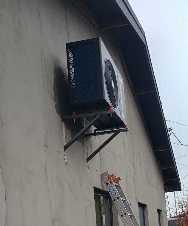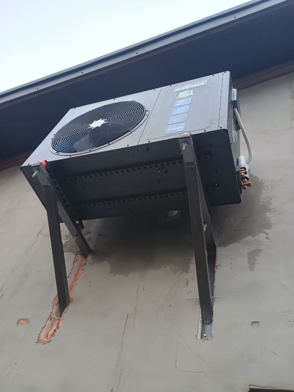 Зовнішній блок теплового насоса Raymer RAY-15DS2-EVI був встановлений на металеву настінну саморобну підставку, жорстко закріплену до несучої стіни будинку. Такий спосіб монтажу дозволяє розмістити обладнання на оптимальній висоті, забезпечити вільну циркуляцію повітря навколо теплообмінника та захистити блок від снігових заметів, вологи та можливих механічних пошкоджень.