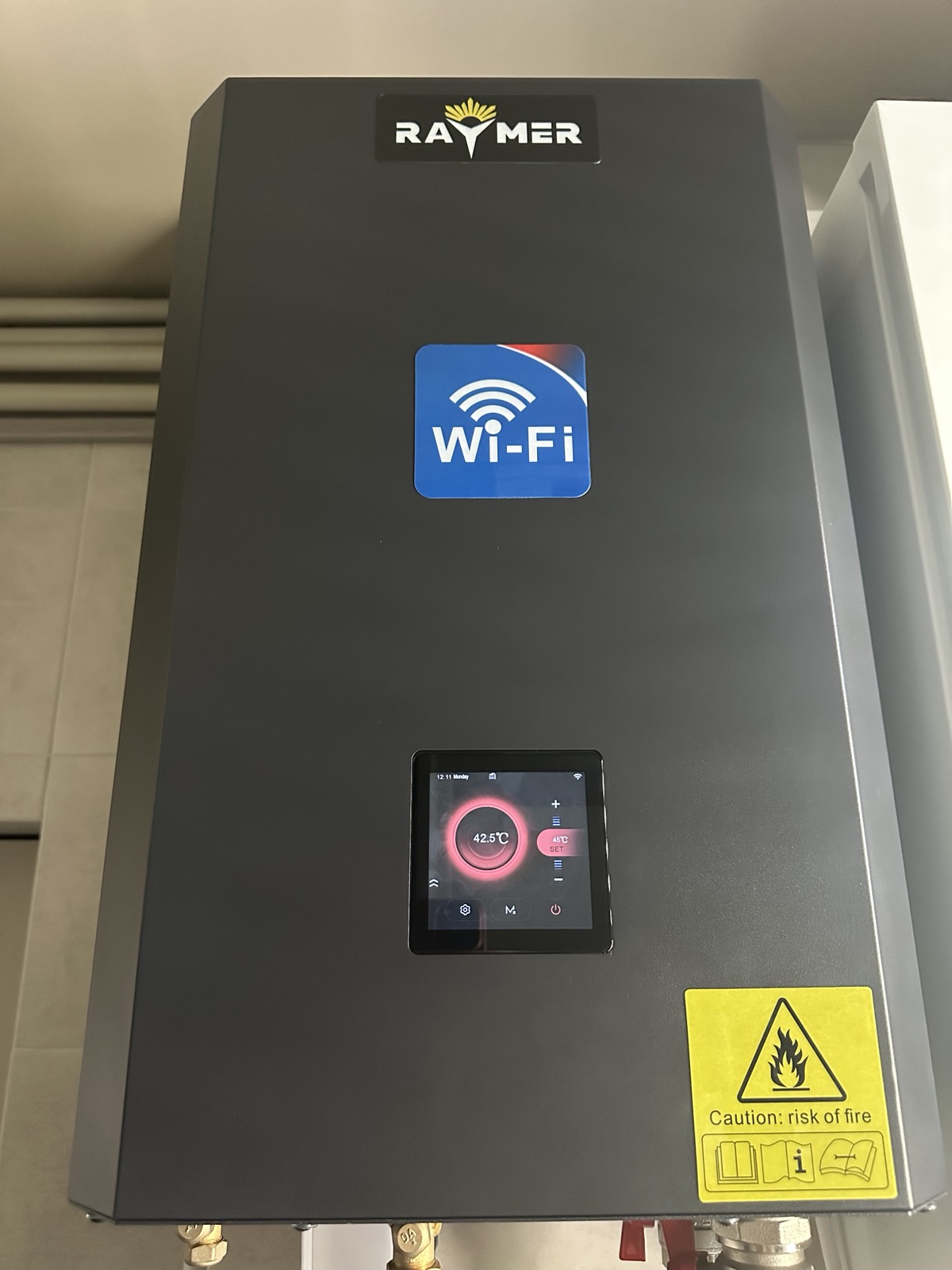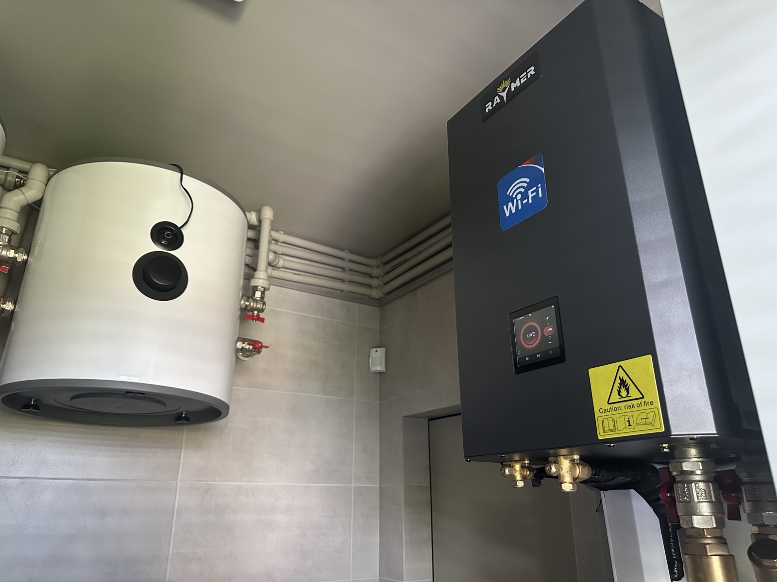 Настінний монтаж та ергономіка: Блок закріплений на стіні на оптимальній висоті. Компактний корпус гідромодуля в чорному кольорі з логотипом Raymer виглядає сучасно та лаконічно, ідеально вписуючись у простір котельні.